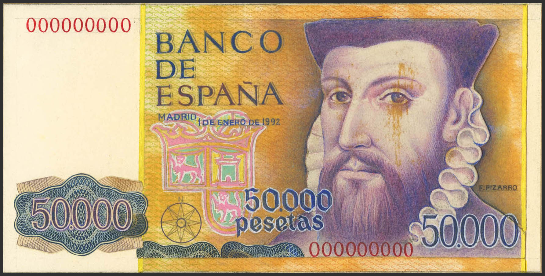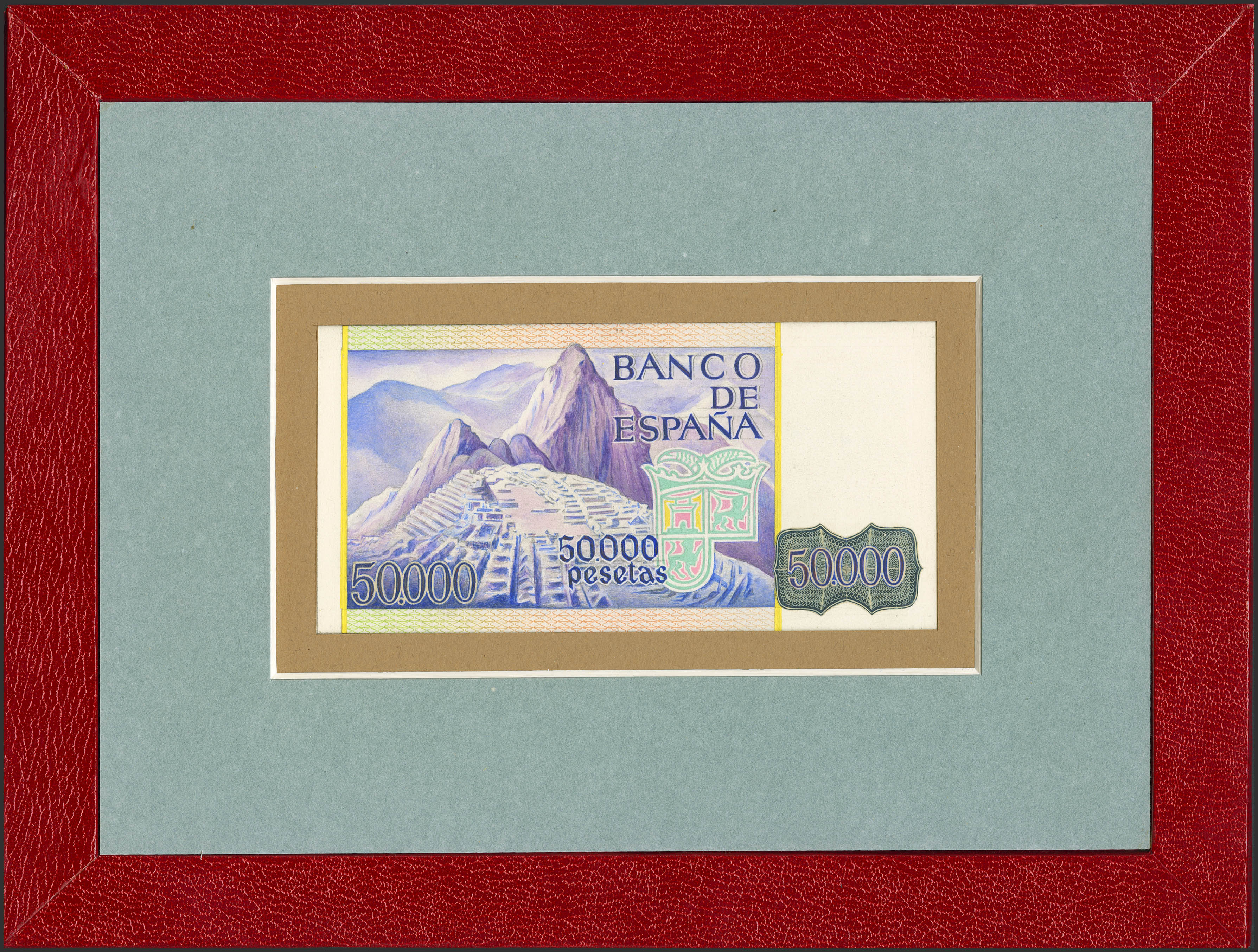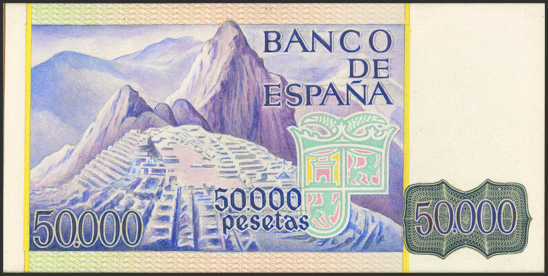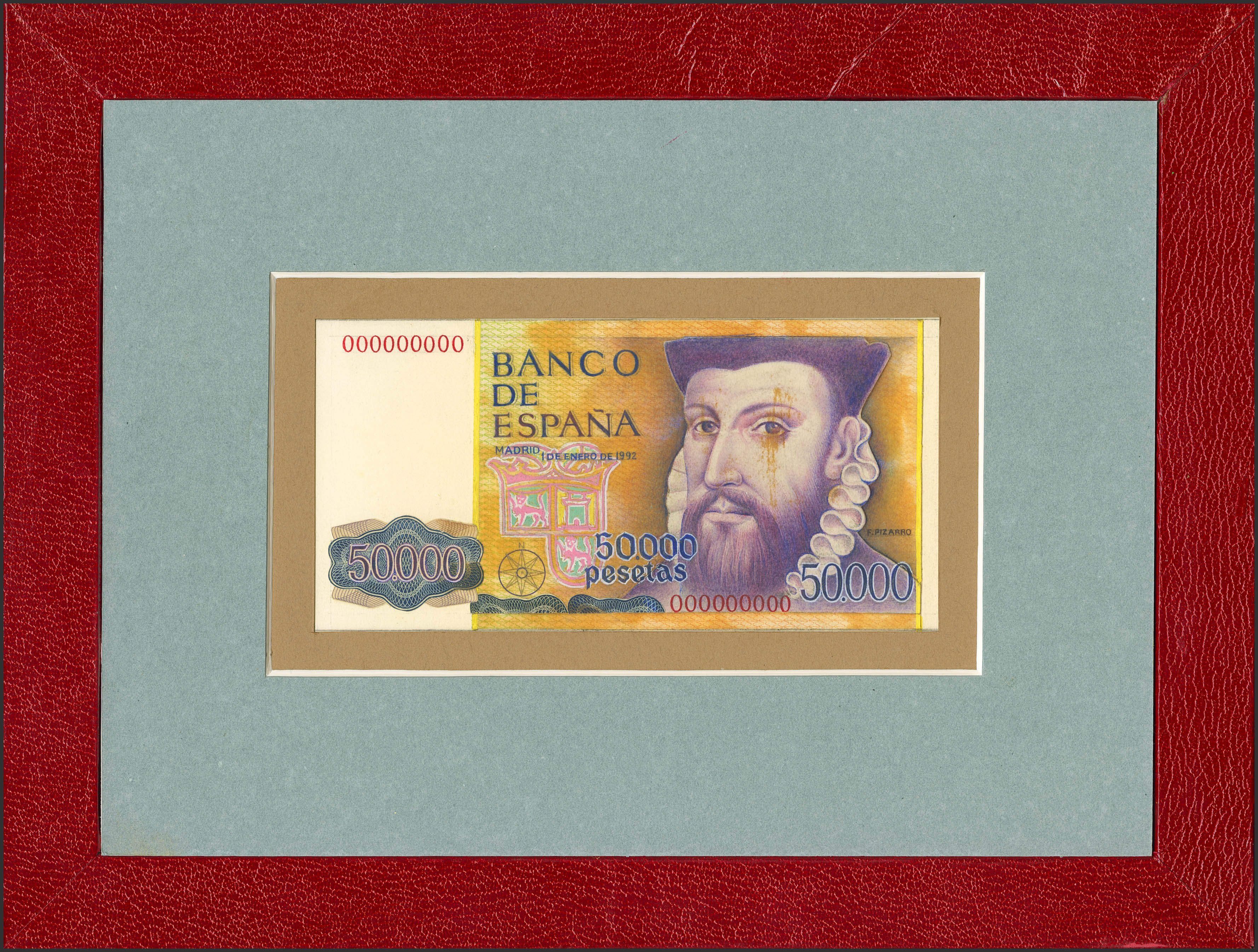 50,000 Pesetas. January 10, 1992. Artist's proof from the Bank of Spain, on a spectacular presentation folder, crafted by hand and numbered 000000000. (Edifil 2023: Not catalogued, Cobo: Not catalogued). A unique piece of enormous importance, as it demonstrates the Bank of Spain's genuine interest in issuing a very high denomination banknote, and, as could be expected, in 1992, commemorating the 500th anniversary of the Discovery of America, in this case dedicated to Pizarro and the ruins of Machu Picchu in Peru. Uncirculated.