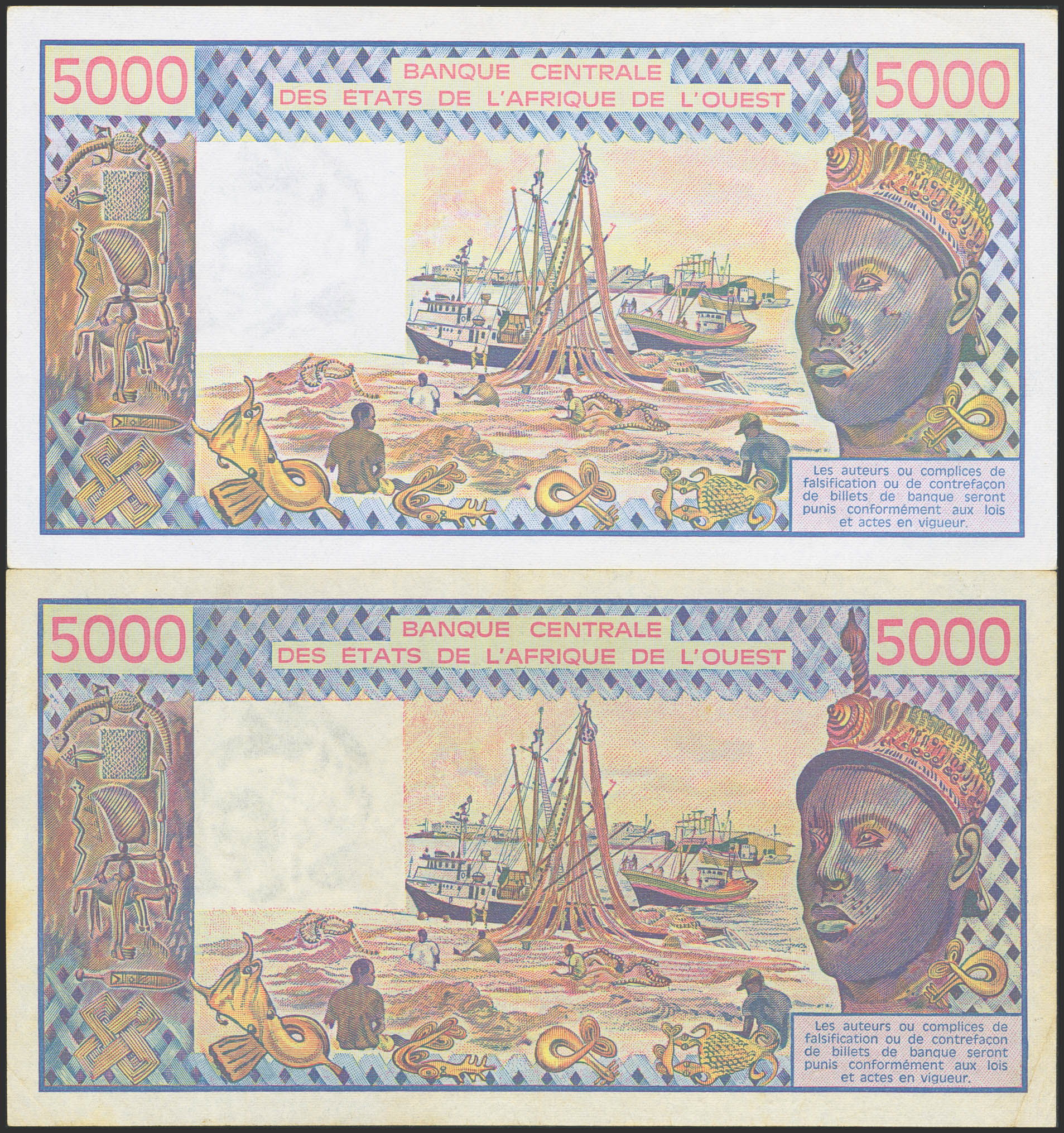 WEST AFRICAN STATES. Lot of 2 notes of 5000 Francs. 1985 and 1990. Banque Centrale des Etats de l'Afrique de l'Ouest. Ivory Coast. (Pick: 108An, 108Aq). Almost Uncirculated and Extremely Fine.