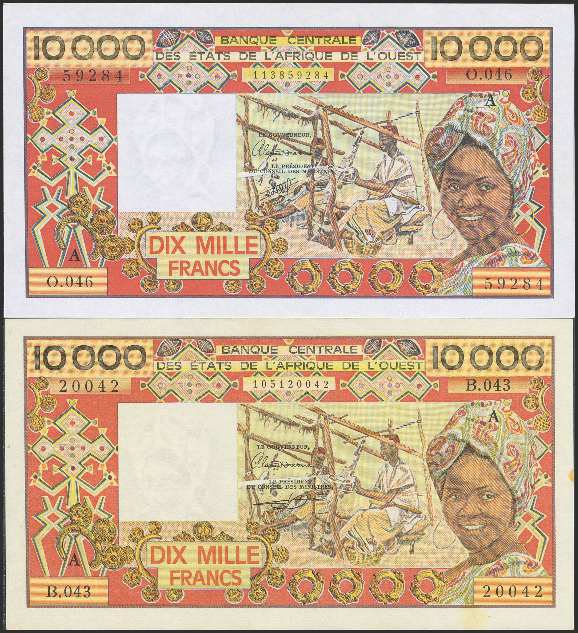 WEST AFRICAN STATES. Lot of 2 notes of 10000 Francs. (1977ca). Banque Centrale des Etats de l'Afrique de l'Ouest. Ivory Coast. (Pick: 109Ai, 109Aj). More than Extremely Fine and Less than Uncirculated.