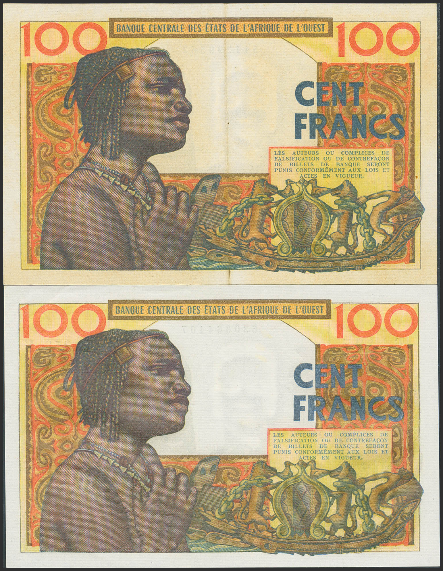 WEST AFRICAN STATES. Lot of 2 notes of 100 Francs. 2 March 1965 and not dated. Banque Centrale des Etats de l'Afrique de l'Ouest. Benin and Senegal. (Pick: 201Be, 701Kf). Almost Uncirculated and Less than Uncirculated.