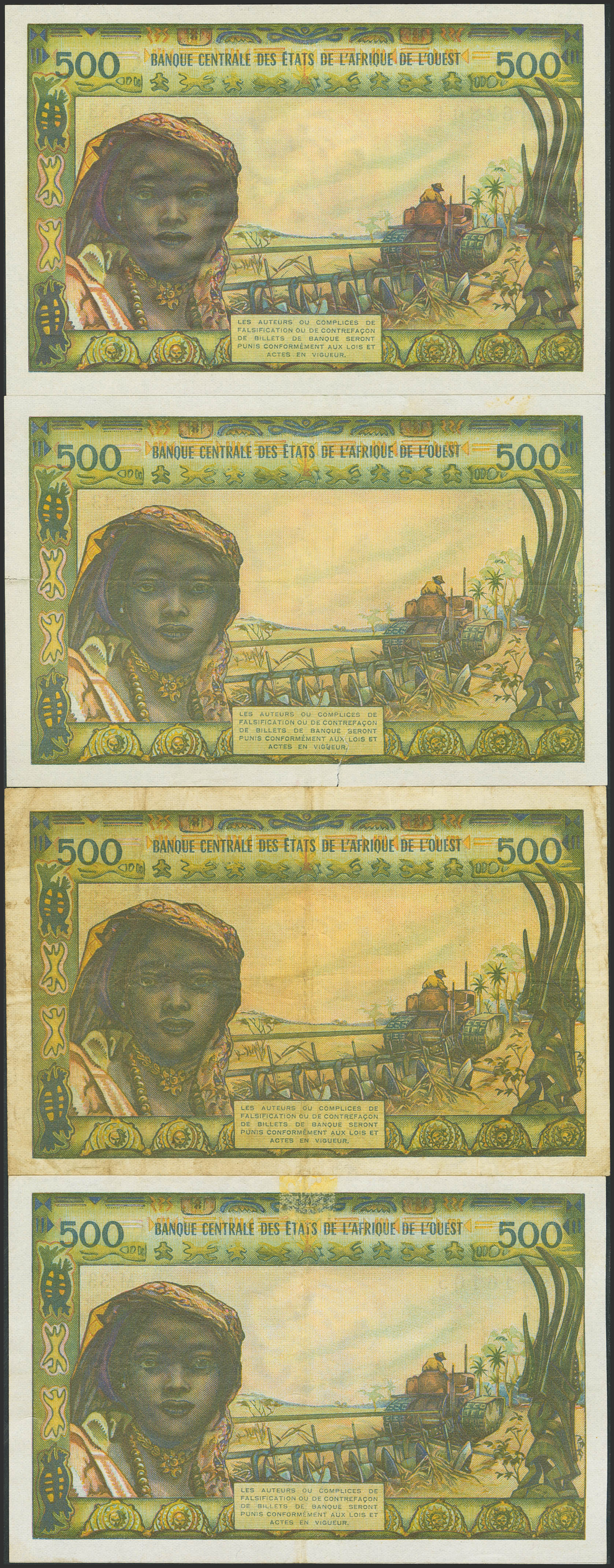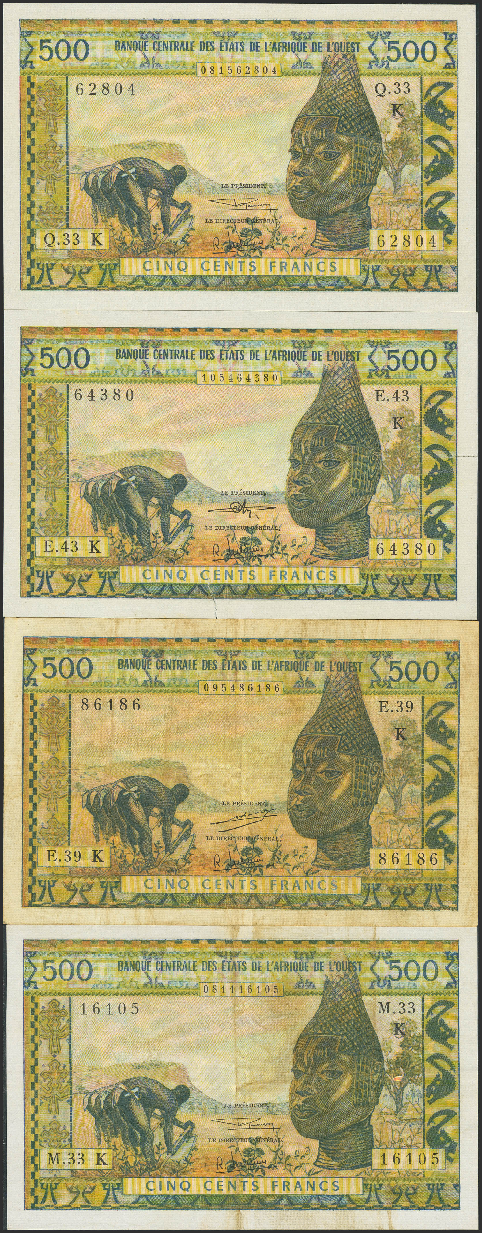 WEST AFRICAN STATES. Lot of 4 notes of 500 Francs. Not dated. Banque Centrale des Etats de l'Afrique de l'Ouest. Senegal. Mixed Signatures. (Pick: 702Kg(2), 702Ki, 702Kj). One of them has a 2 centimeter tear on the bottom edge. Very Fine (2) and Extremely Fine (2).