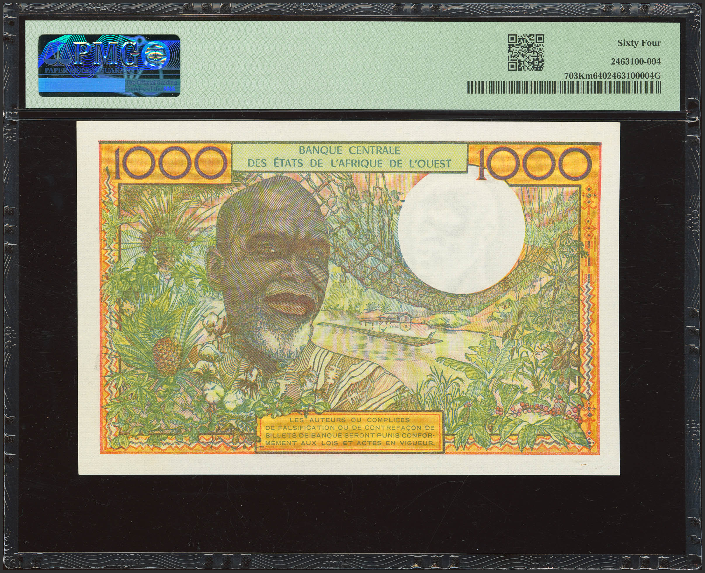 WEST AFRICAN STATES. 1000 Francs. (1960ca). Banque Centrale des Etats de l'Afrique de l'Ouest. Senegal. Signatures of HC Bedie and A. Fadiga. (Pick: 703Km). PMG64.