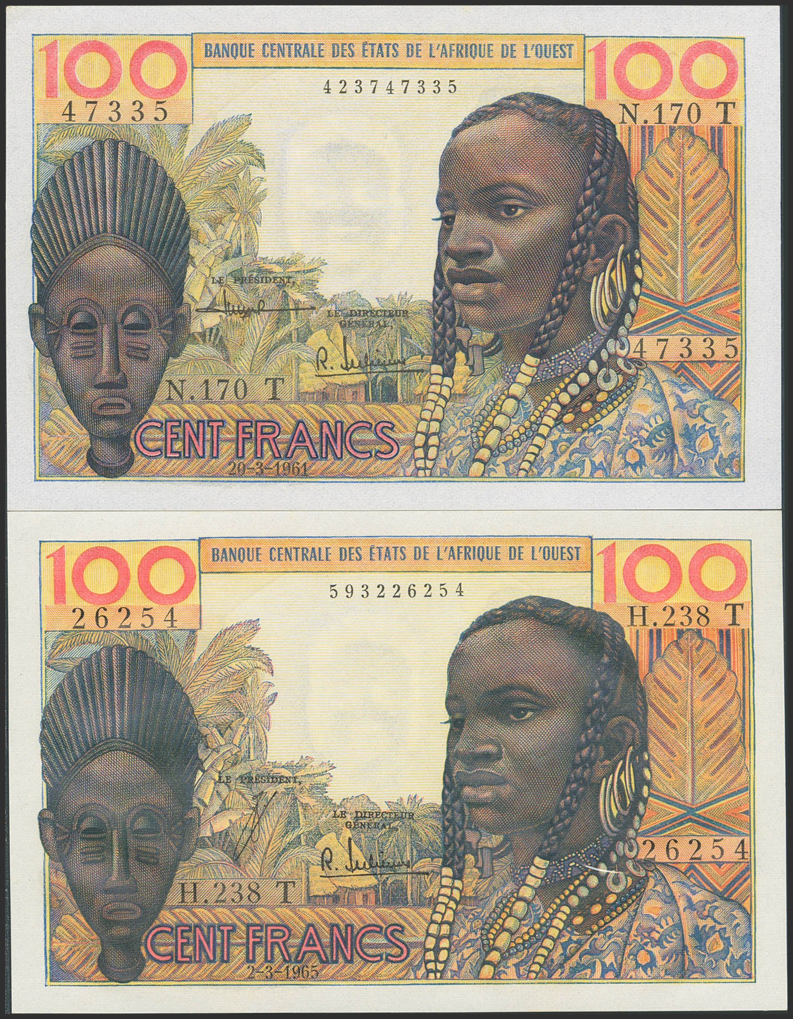 WEST AFRICAN STATES. Lot of 2 notes of 100 Francs. 1961 and 1965. Banque Centrale des Etats de l'Afrique de l'Ouest. Togo. (Pick: 801Tb, 801Te). Less than Uncirculated.