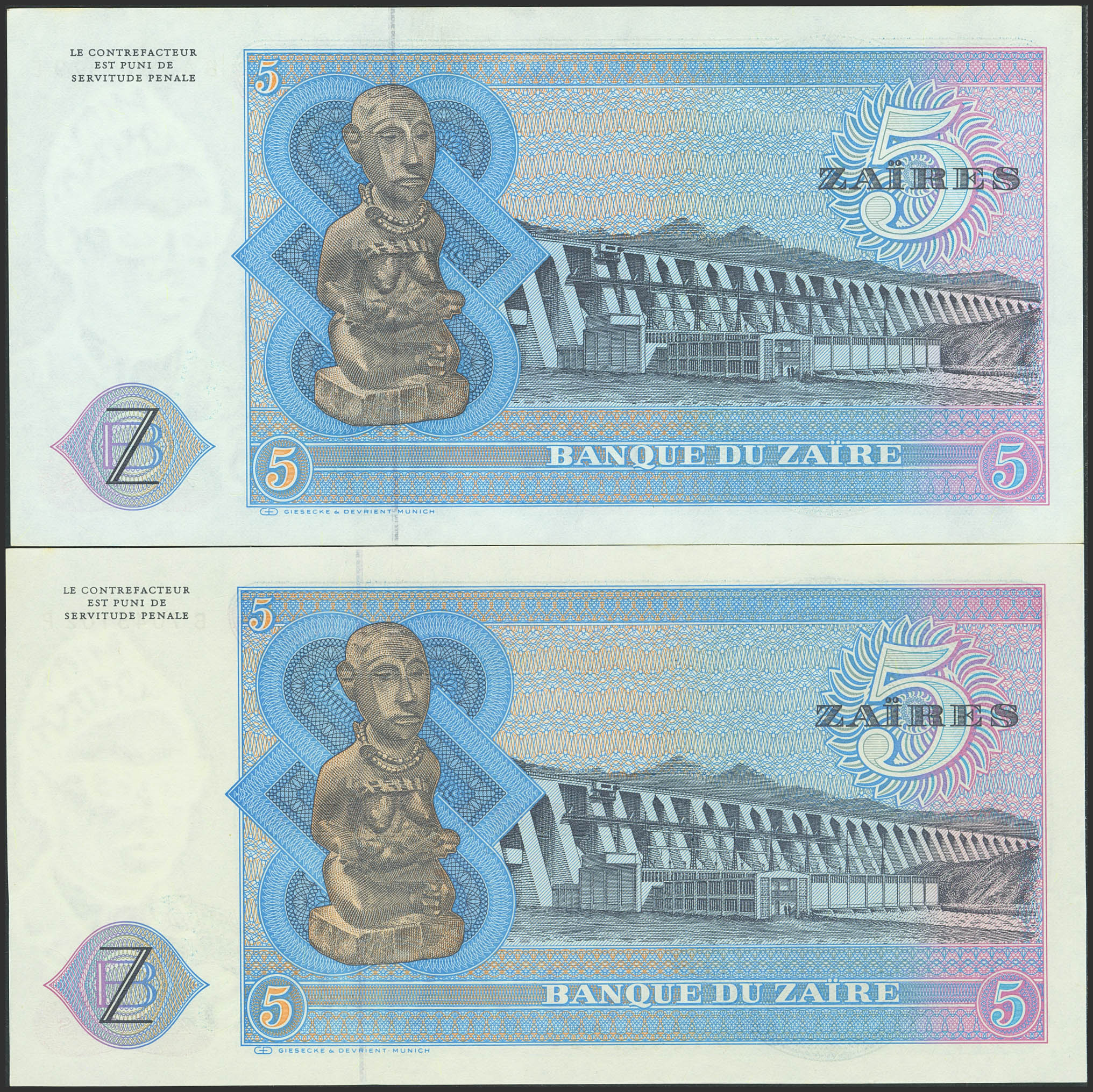 ZAIRE. Lot of 2 notes of 5 Zaires. 20 May 1979 and 27 October 1980. Banque du Zaire. (Pick: 22a, 22b). Uncirculated and Less than Uncirculated.