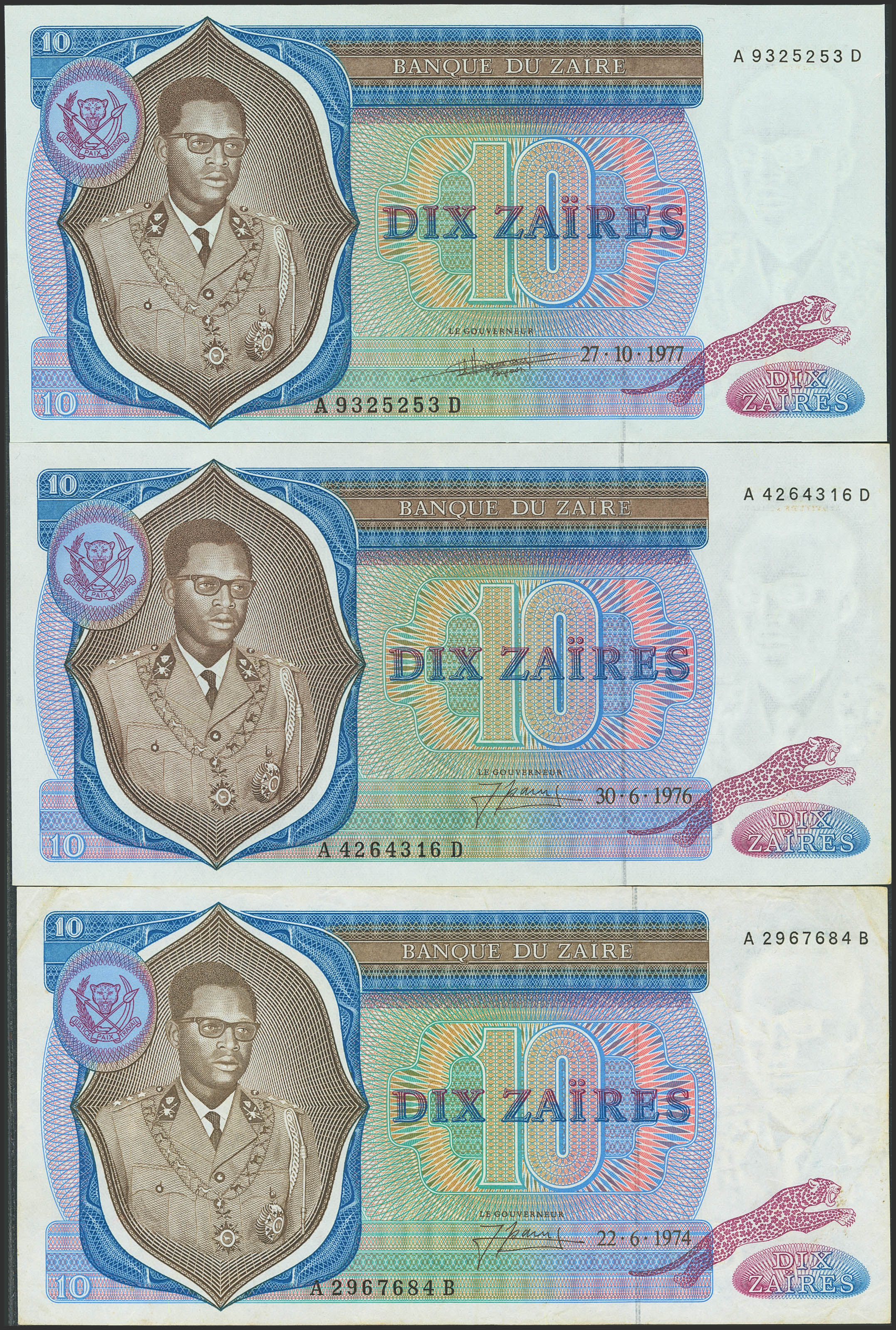 ZAIRE. Lot of 3 notes of 10 Zaires. 22 June 1974. Banque du Zaire. (Pick: 23a(2), 23b). Very Fine, Less than Uncirculated and Uncirculated.