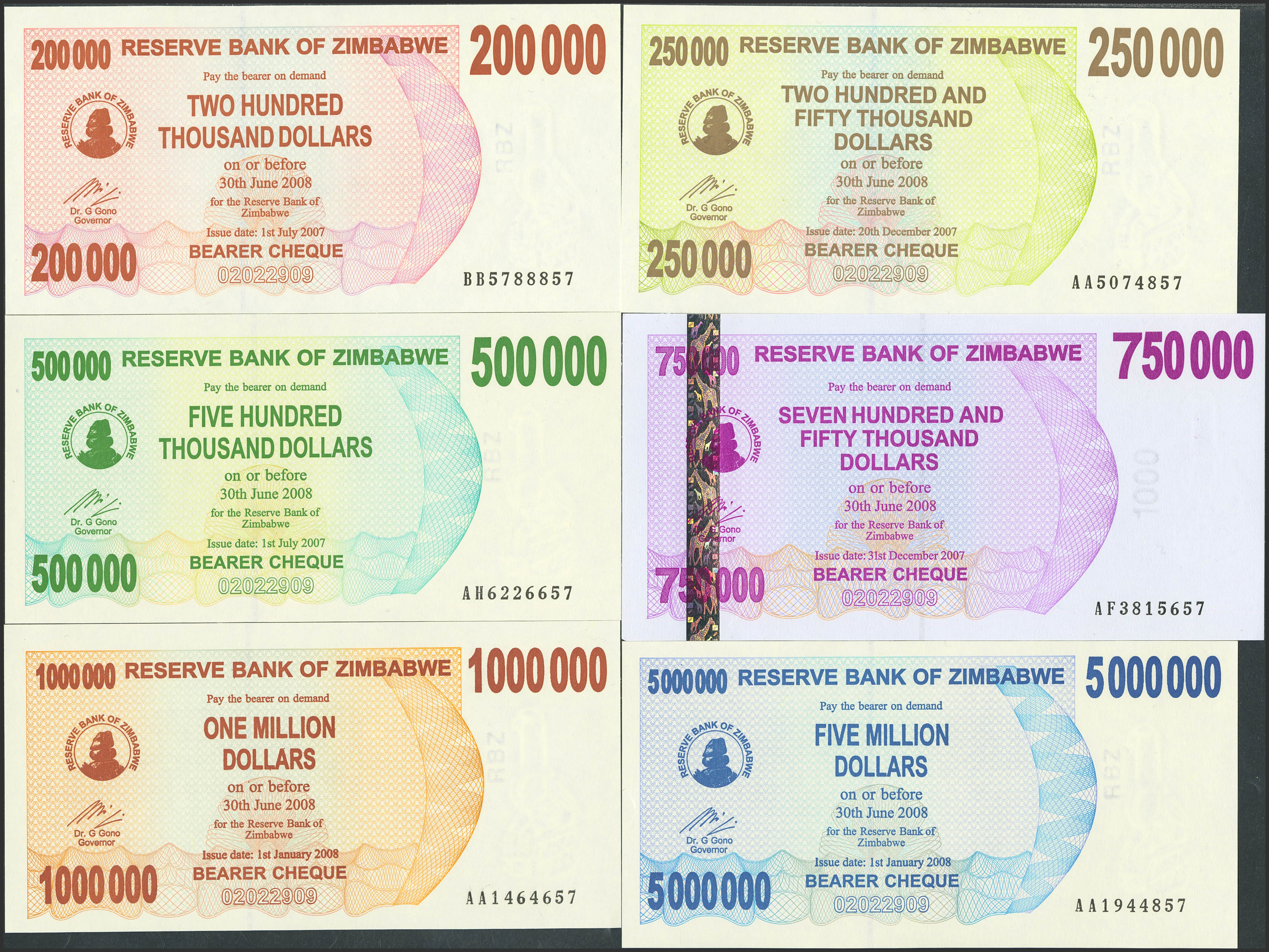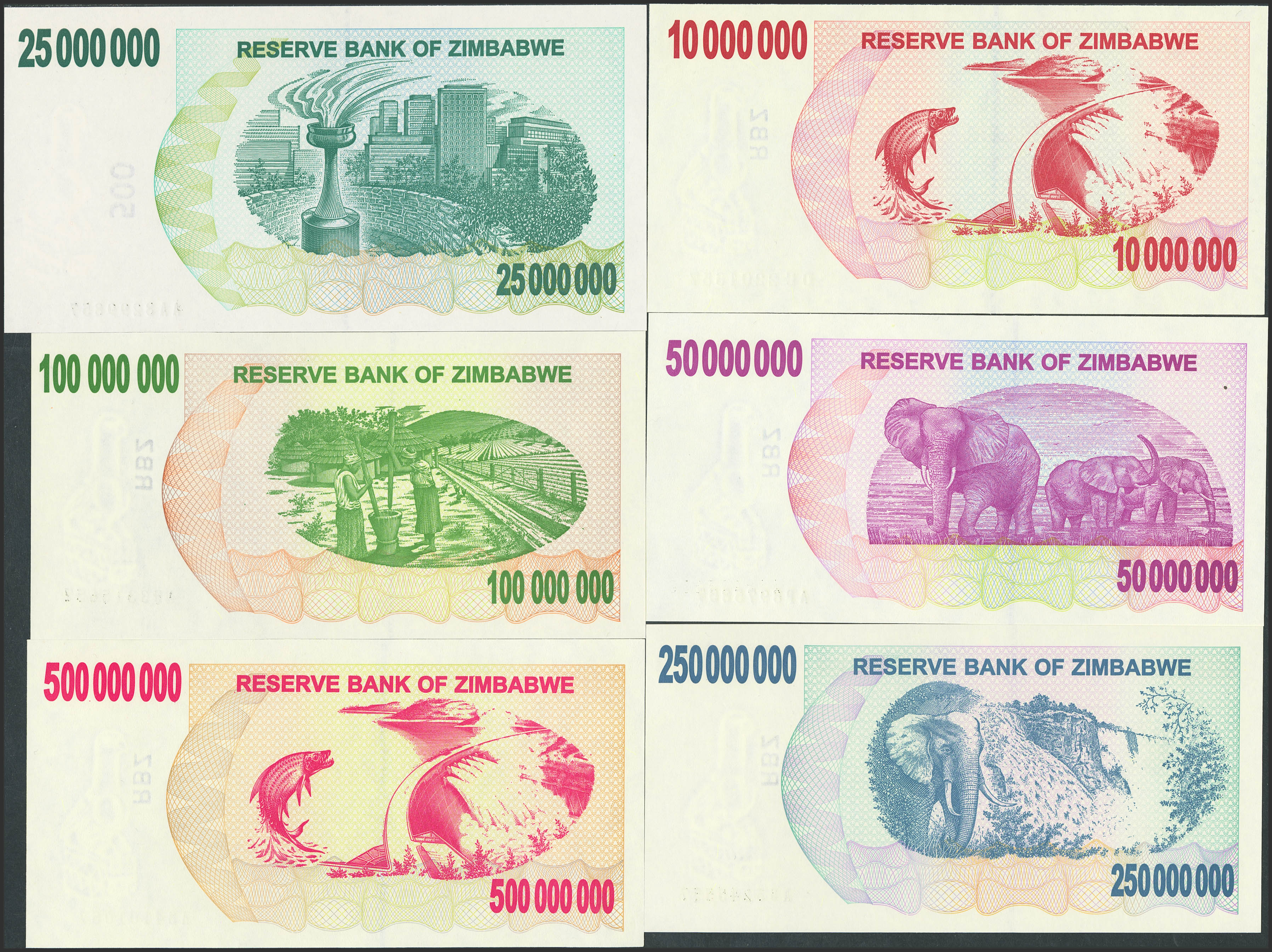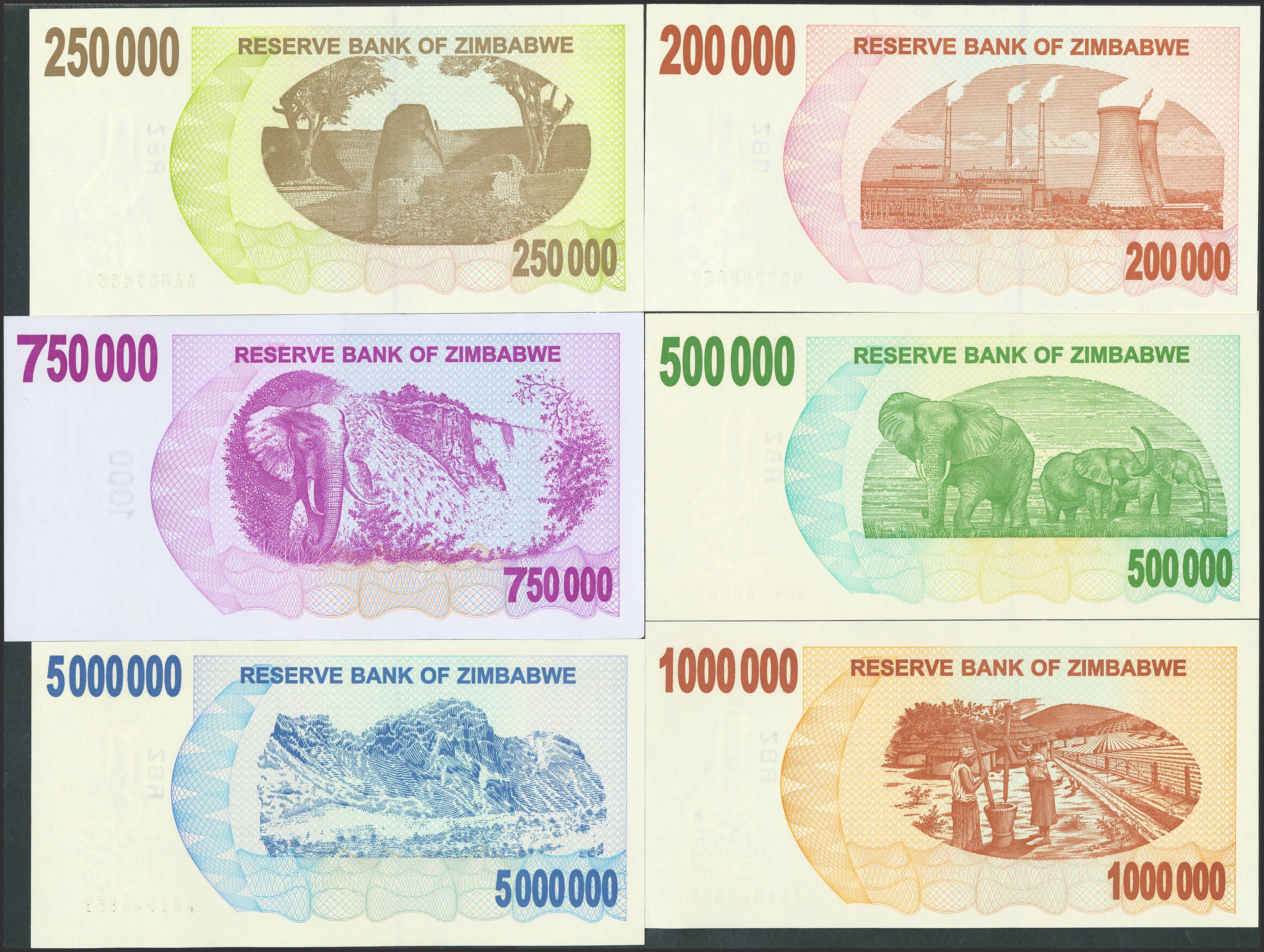 ZIMBABWE. Lot of 12 notes from 200000 to 500000000 Dollars. 2007 and 2008. Reserve Bank. Bearer Checks. (Pick: 49, 50, 51, 52, 53, 54, 55b, 56, 57, 58, 59, 60). Uncirculated.