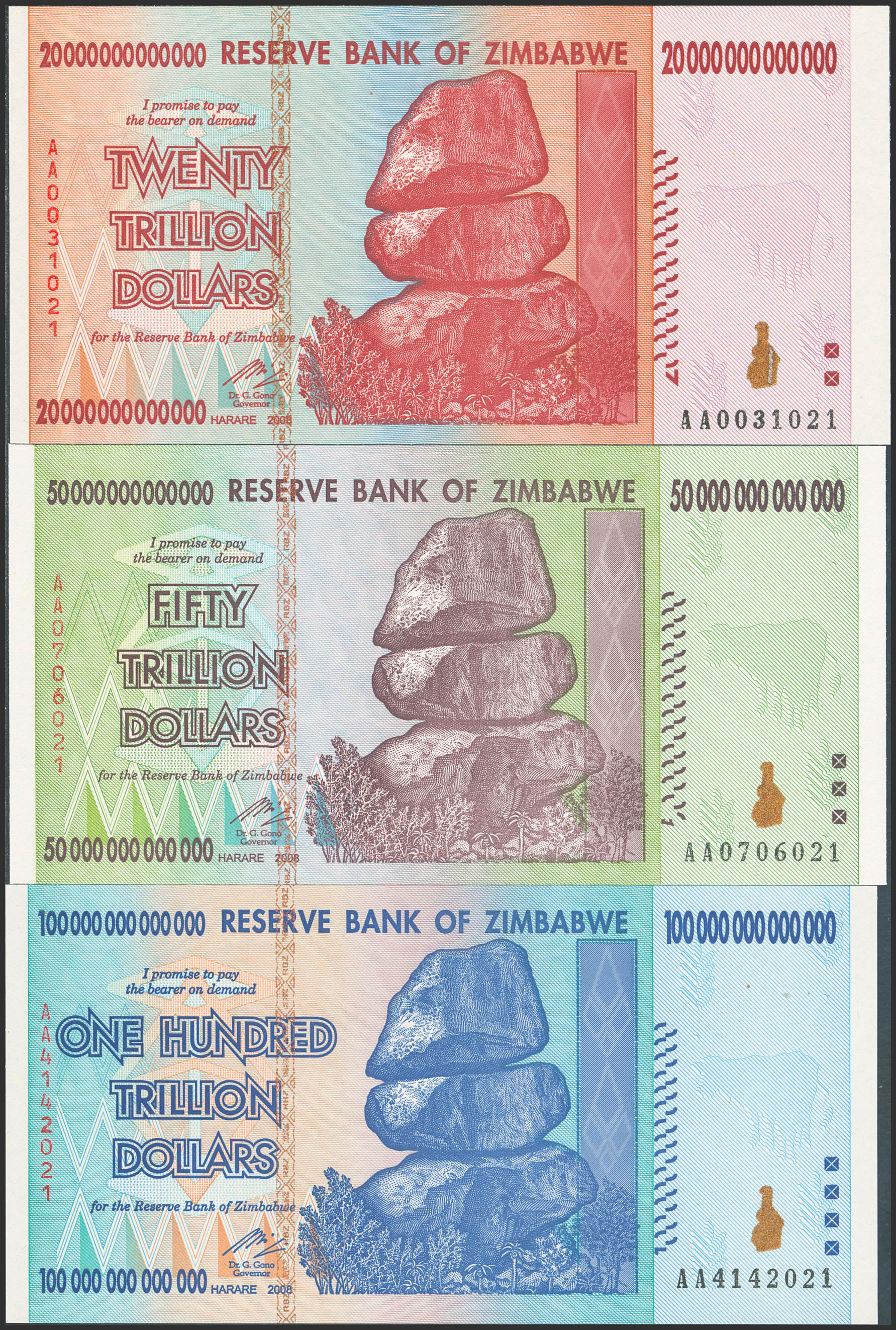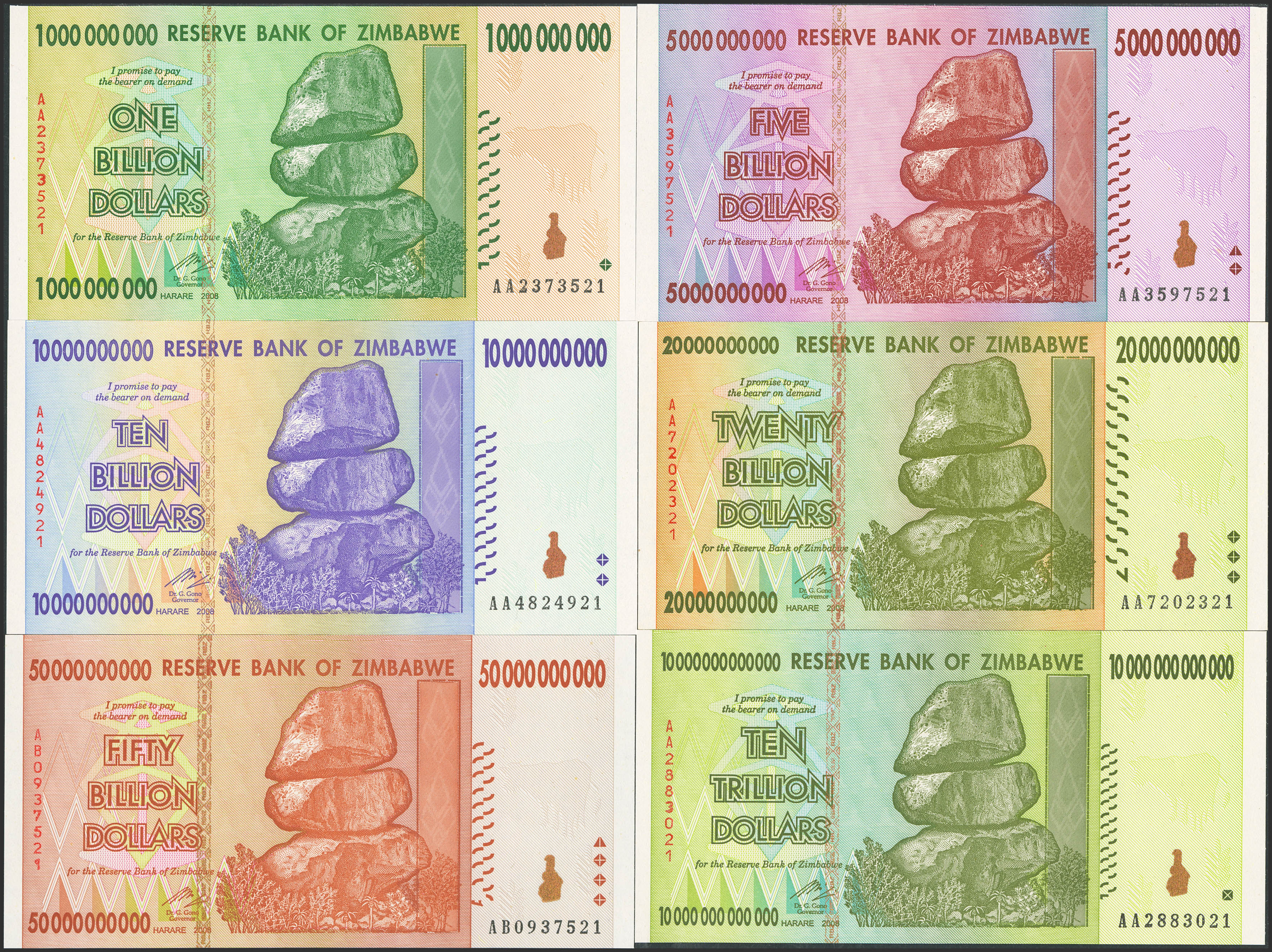 English ZIMBABWE. Lot of 9 notes from 1000000000 to 100000000000000 Dollars. 2008. Reserve Bank. (Pick: 83, 84, 85, 86, 87, 88, 89, 90, 91). Uncirculated.