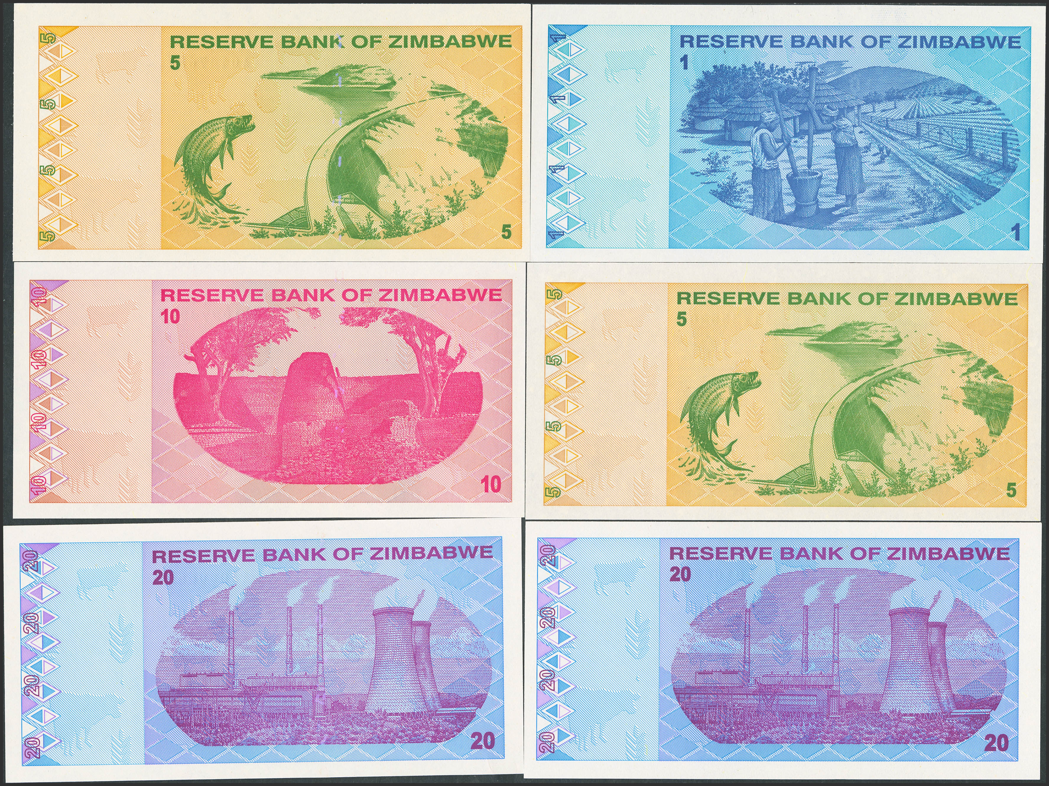 English ZIMBABWE. Complete set of 9 notes from 1 to 500 dollars some repeated. 2009. Reserve Bank. (Pick: 92, 93(2), 94, 95(2), 96, 97, 98). Uncirculated.