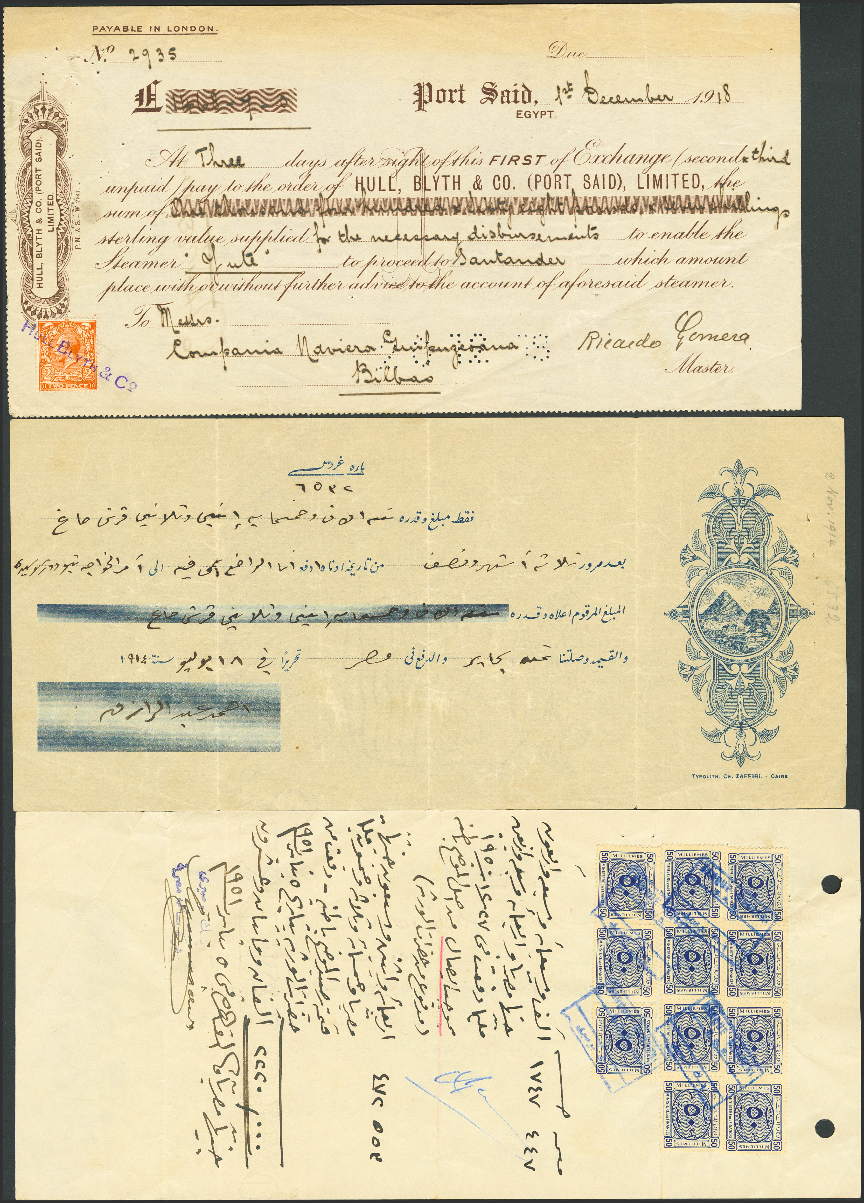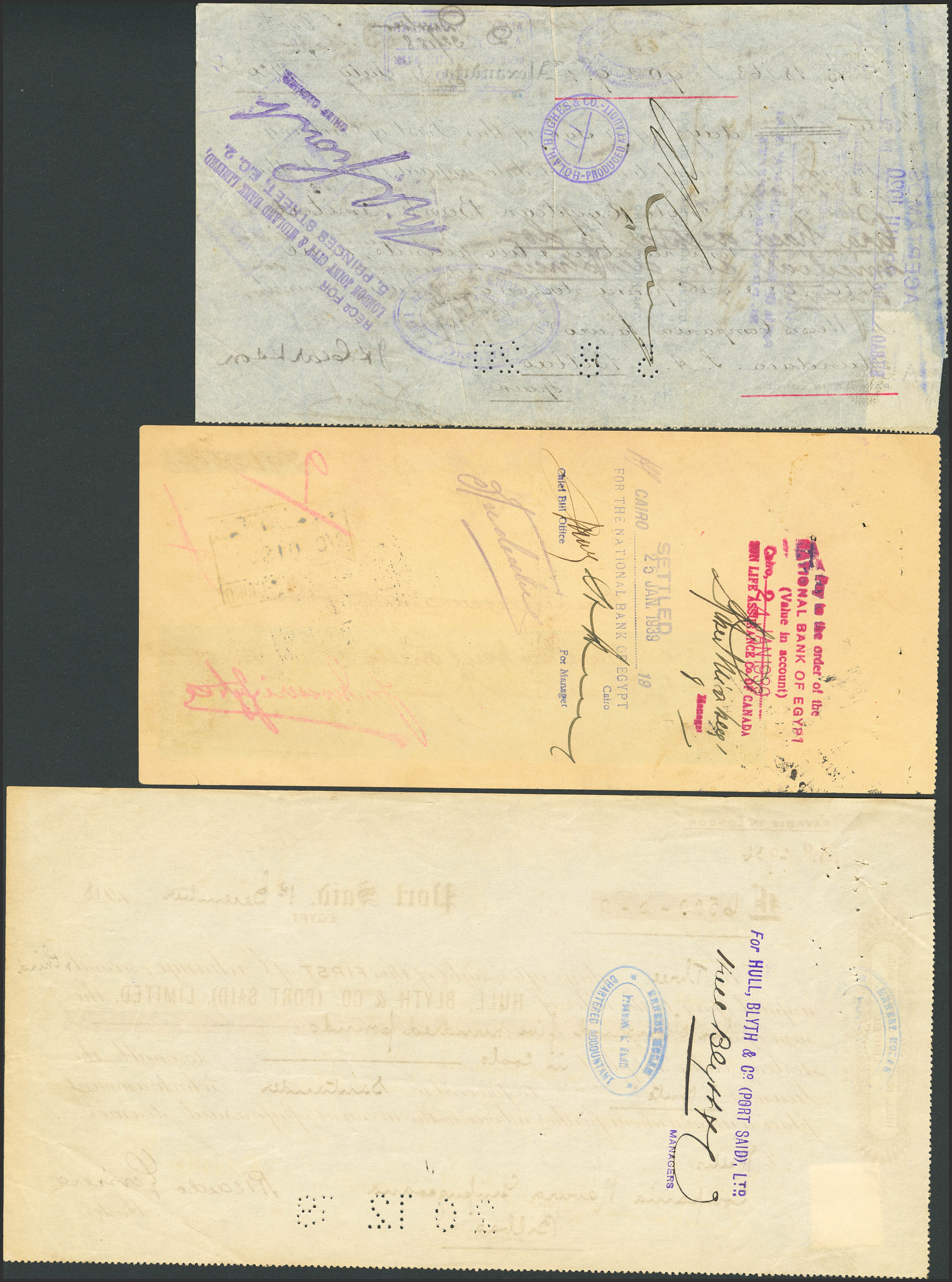 MIUncirculatedELLANEUS. Lot of 6 Egyptian bank checks. 1918 to 1939. Different issuers. (Pick: Unlisted). Very Fine and Extremely Fine.