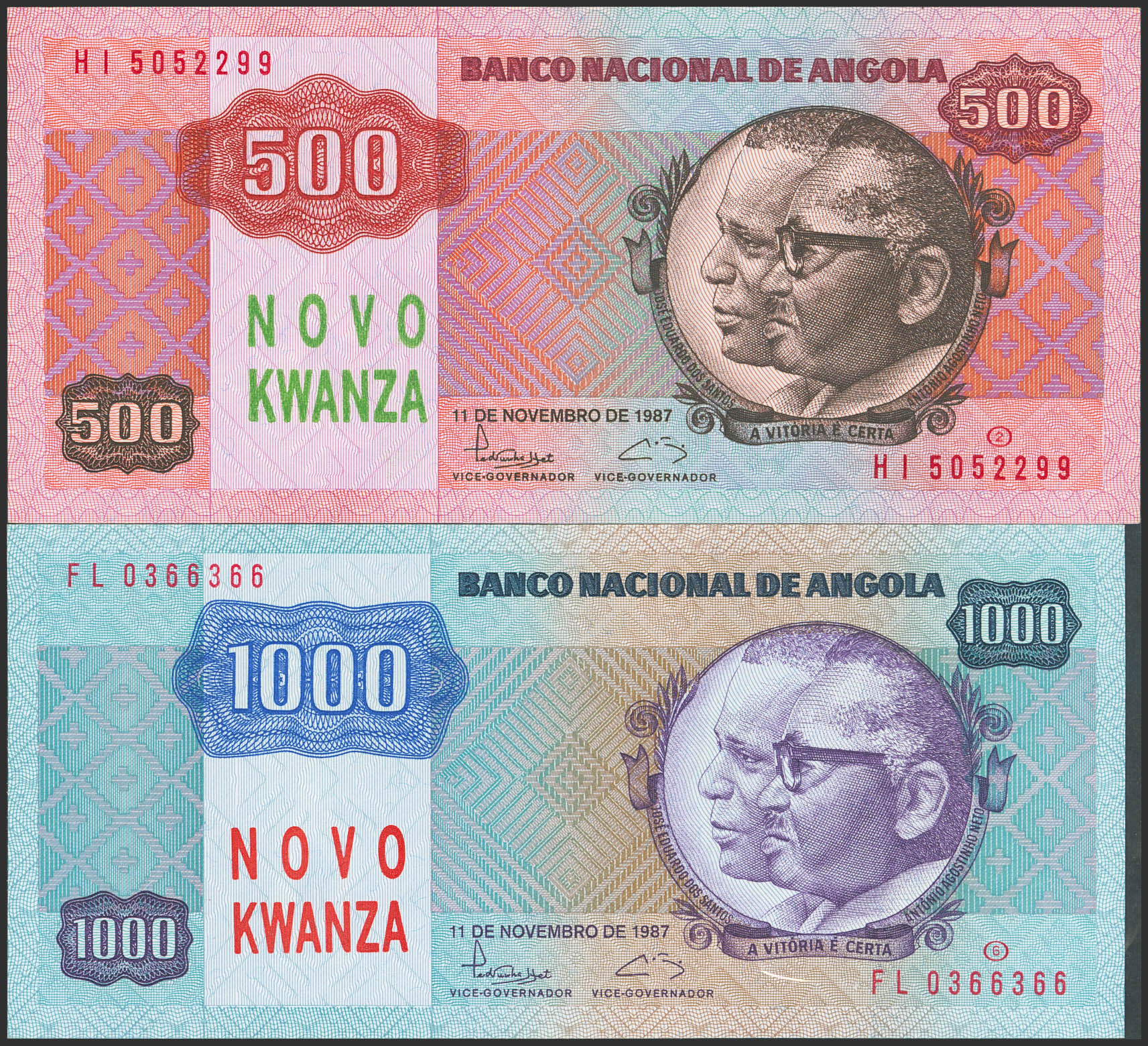English ANGOLA. Lot of 2 notes of 500 and 1000 Novo Kwanza. (1991ca). National Bank. (Pick: 123, 124). Uncirculated.