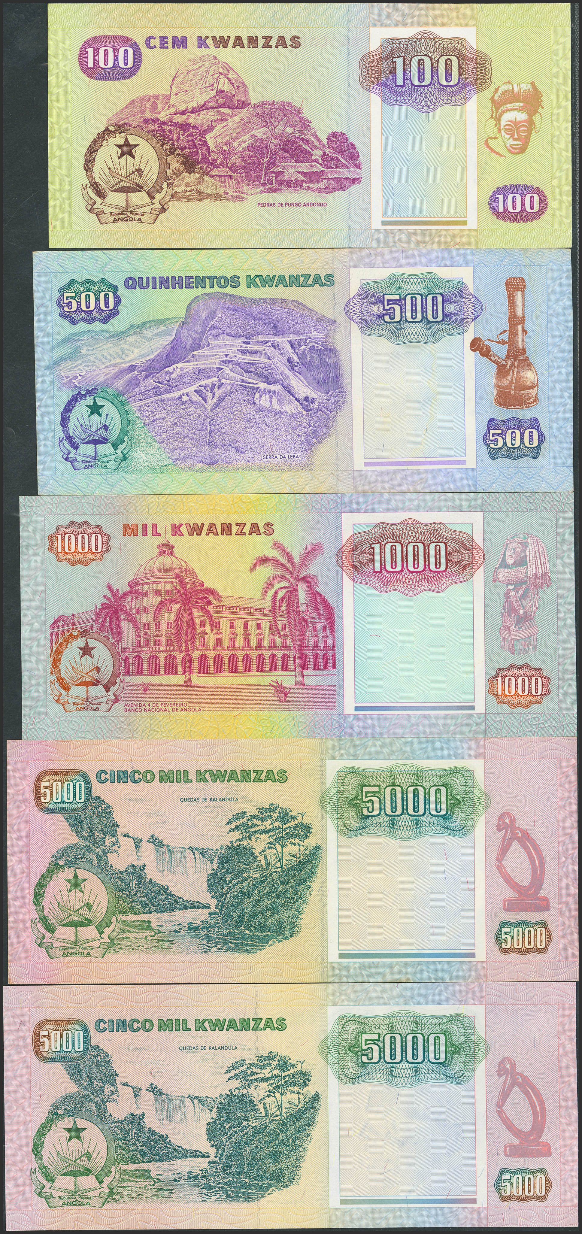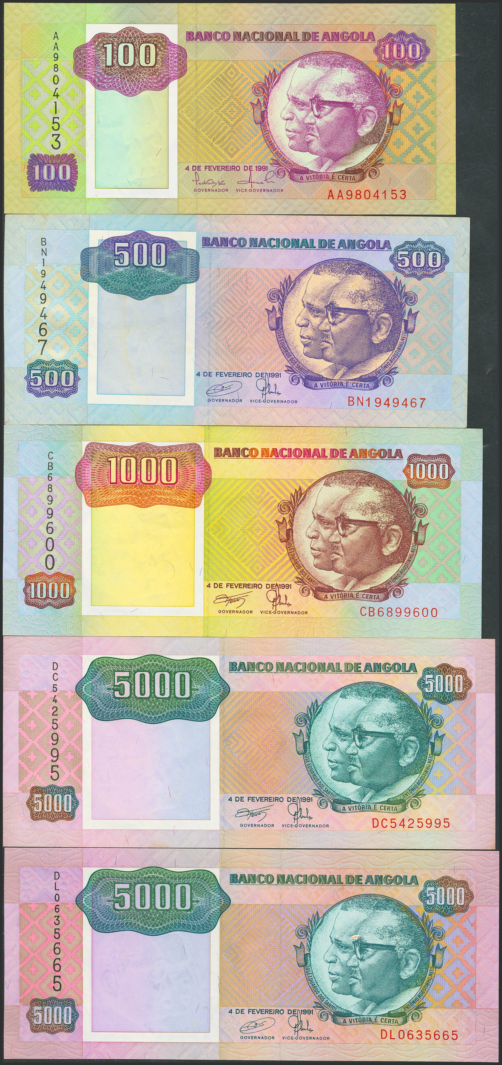 ANGOLA. Lot of 5 notes from 100 to 5000 Kwanza. 1991. National Bank. (Pick: 126, 128, 129, 130b, 130c). Uncirculated (3) and Almost Uncirculated (2).