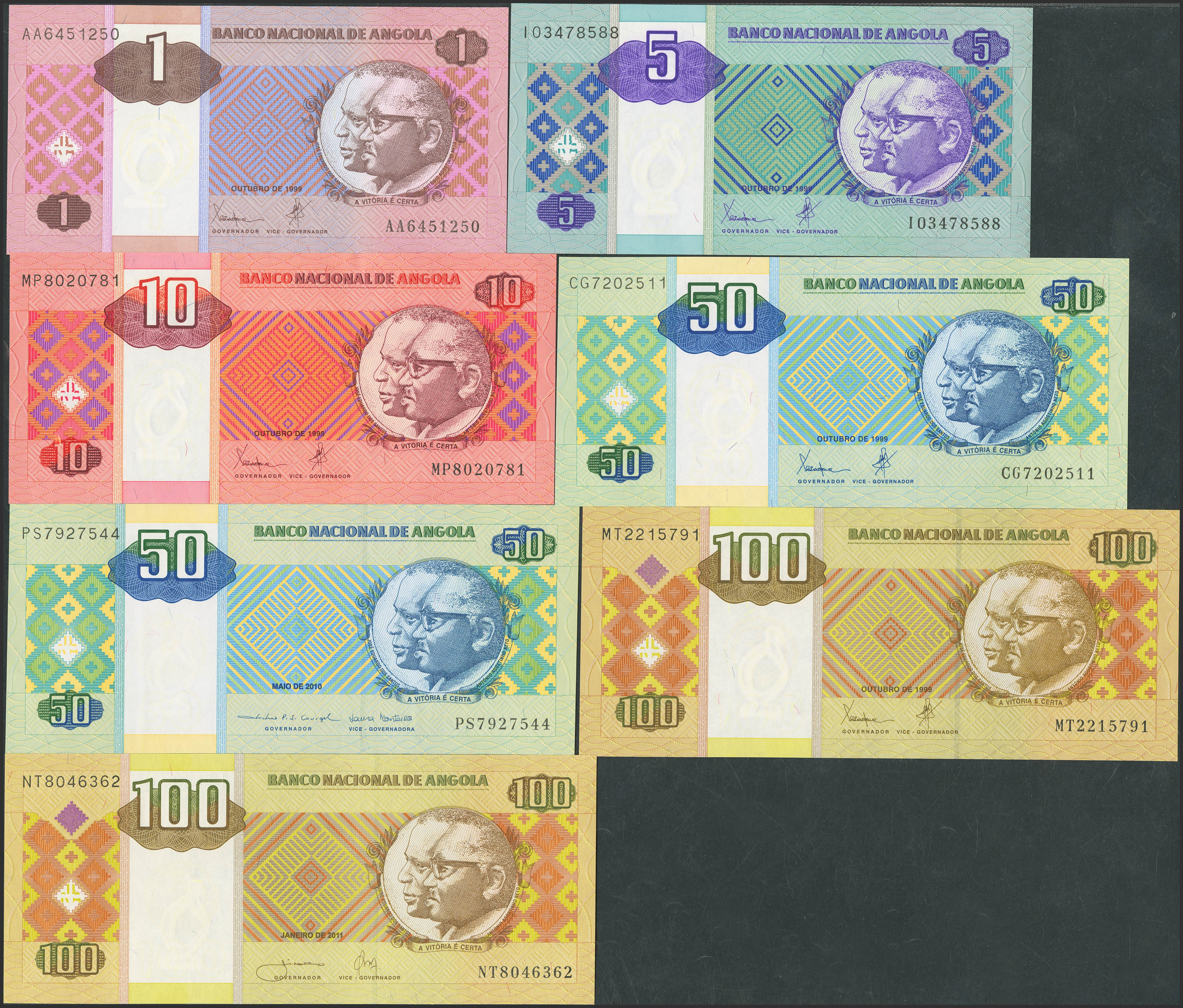 ANGOLA. Lot of 7 notes from 1 to 100 Kwanzas. 1999 to 2011. National Bank. (Pick: 143, 144a, 145a, 146a, 146b, 147a, 147b). Uncirculated.