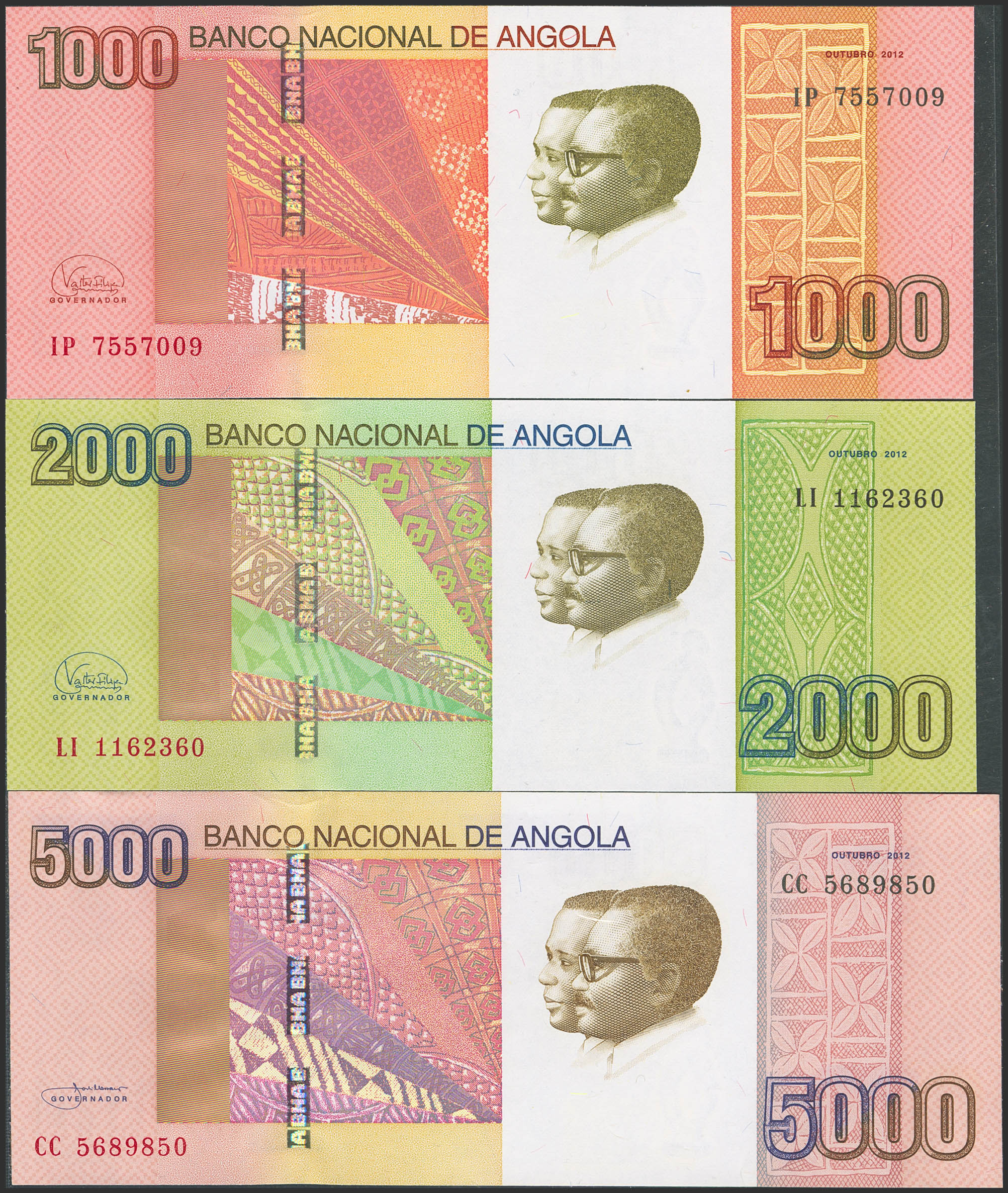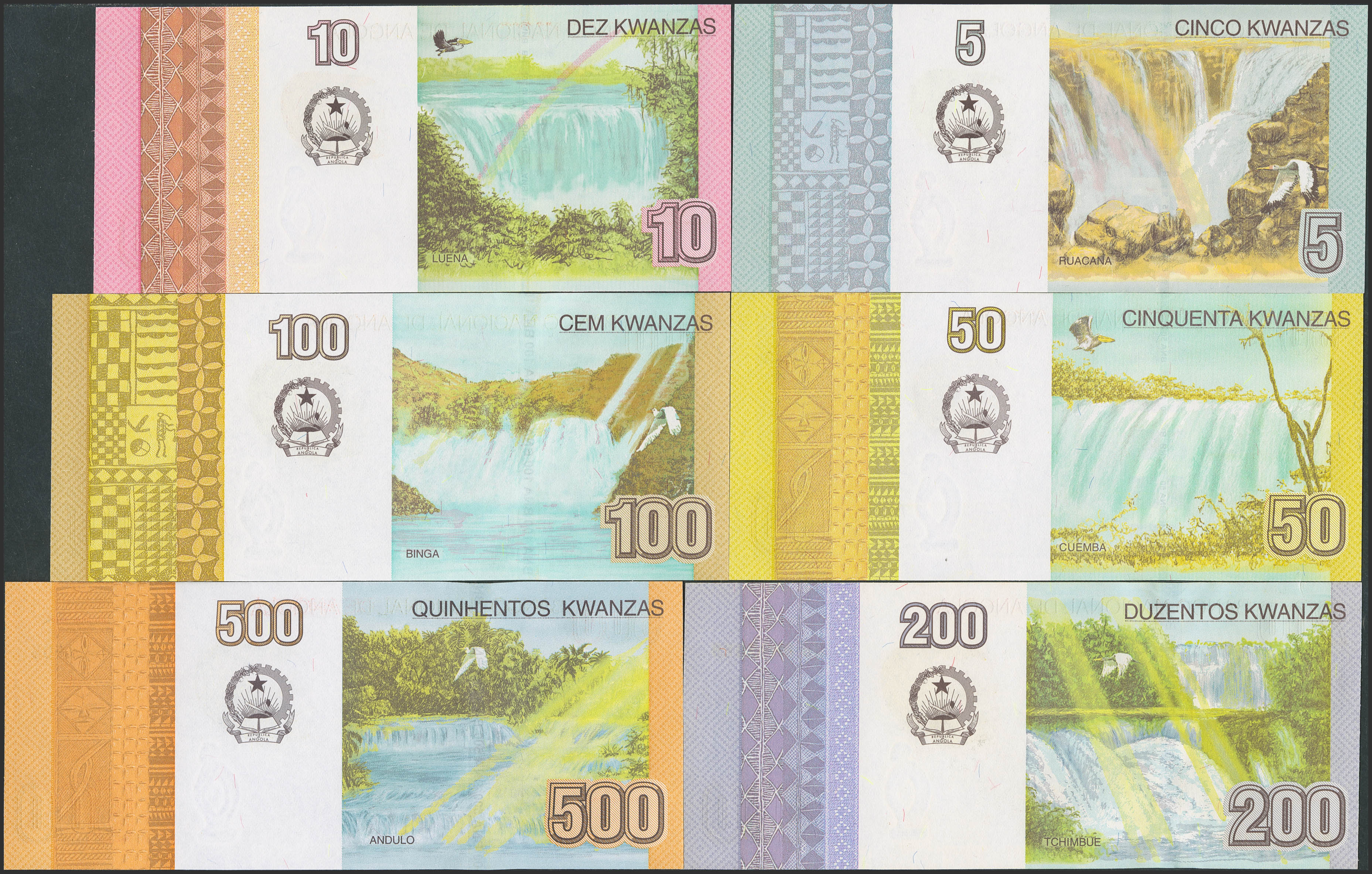 ANGOLA. Lot of 9 notes from 5 to 5000 Kwanzas. 2012. National Bank. (Pick: 151A, 151B, 152, 153b, 154, 155b, 156b, 157b, 158). Uncirculated.