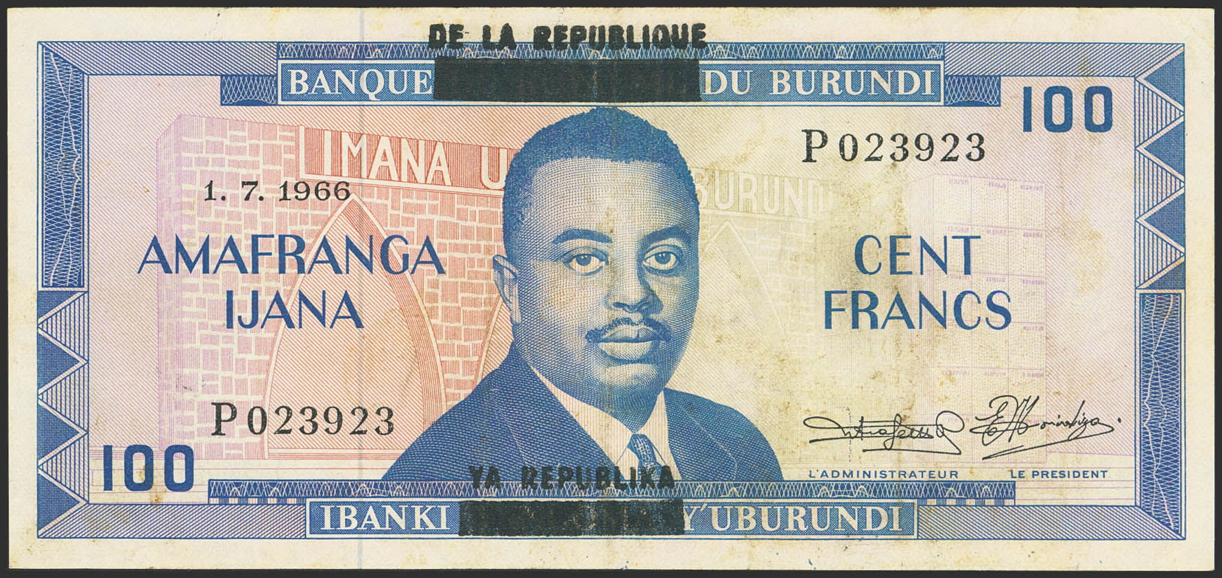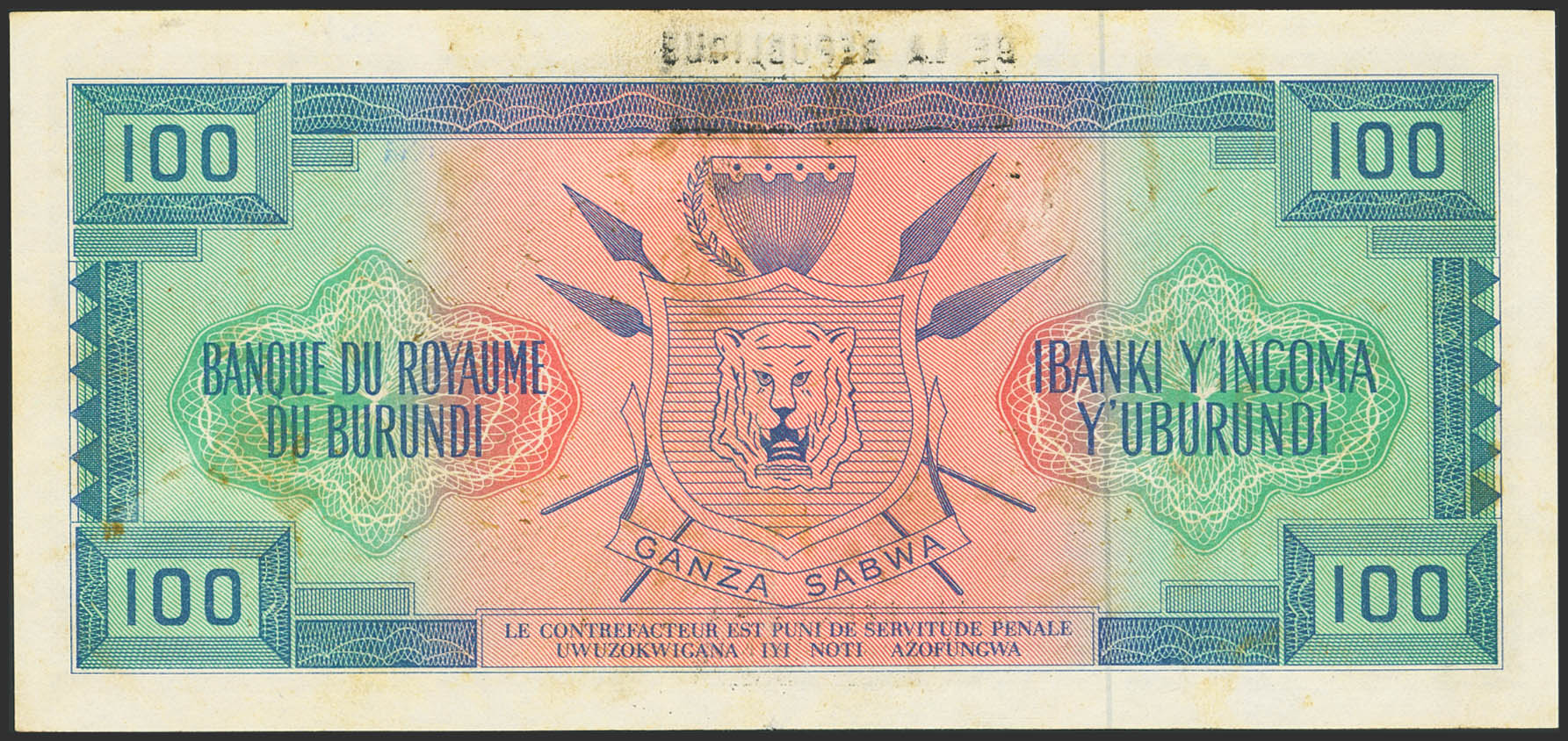 BURUNDI. 100 Francs. 1 July 1966. Banque de la Republique. (Pick: 17b). Flattened. More than Very Fine.