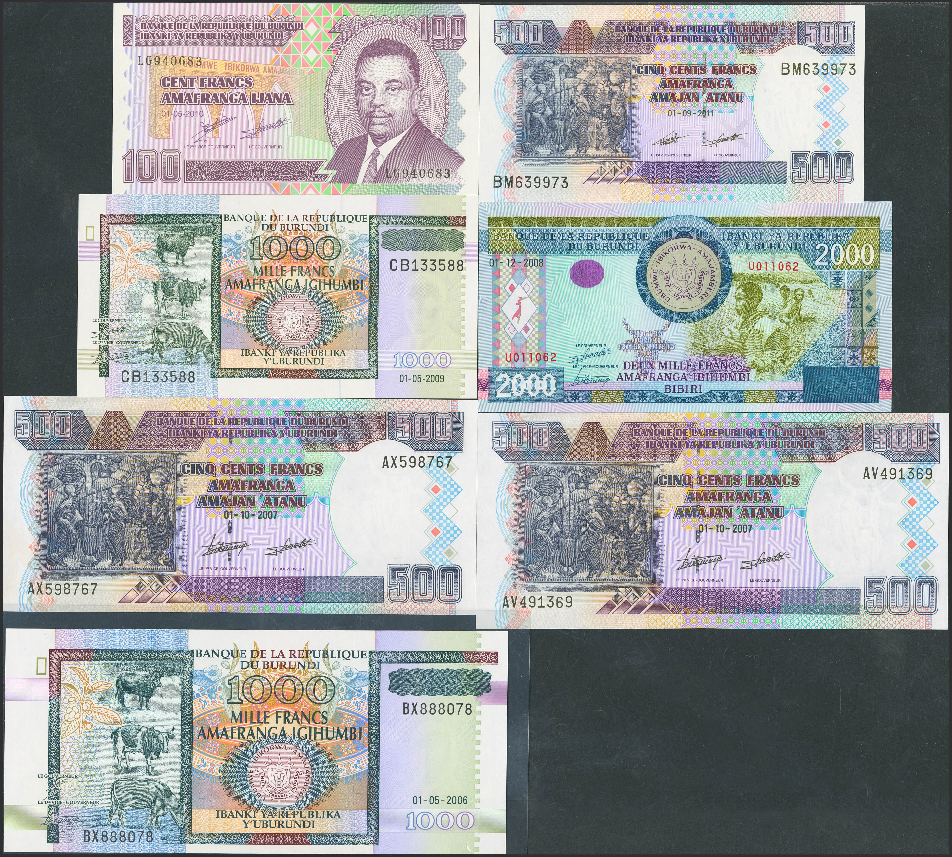 BURUNDI. Lot of 7 notes from 100 to 2000 Francs. 2006 to 2011. Banque de la Republique. (Pick: 38d(2), 39d, 44a, 45b, 46, 47). Uncirculated.