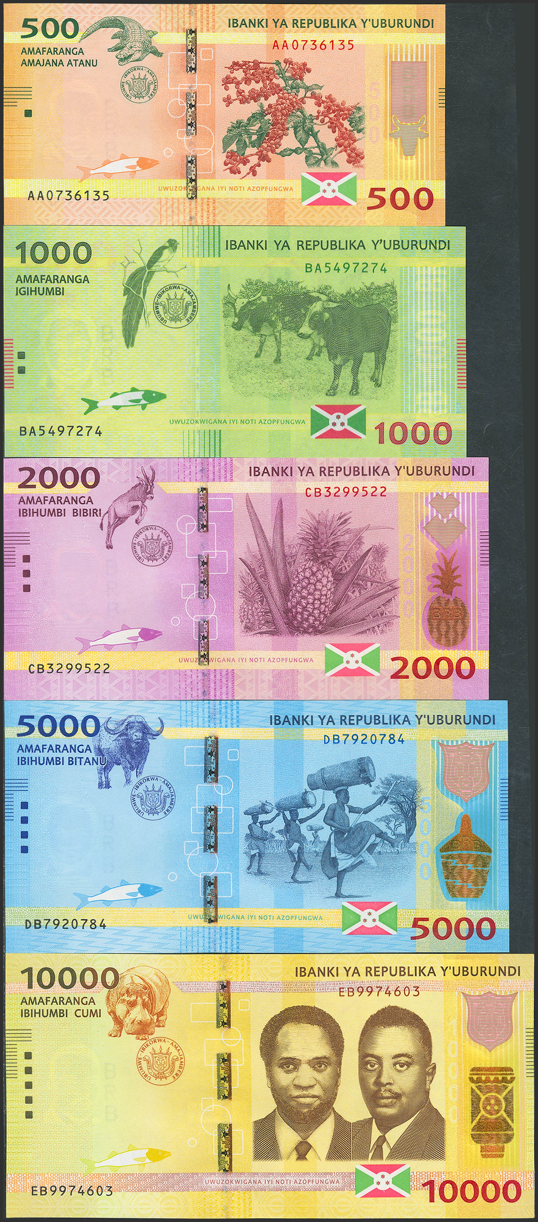 BURUNDI. Complete set of 5 notes from 500 to 10000 Francs. 15 January 2015. Banque de la Republique. (Pick: 50a, 51a, 52a, 53a, 54a). Uncirculated.