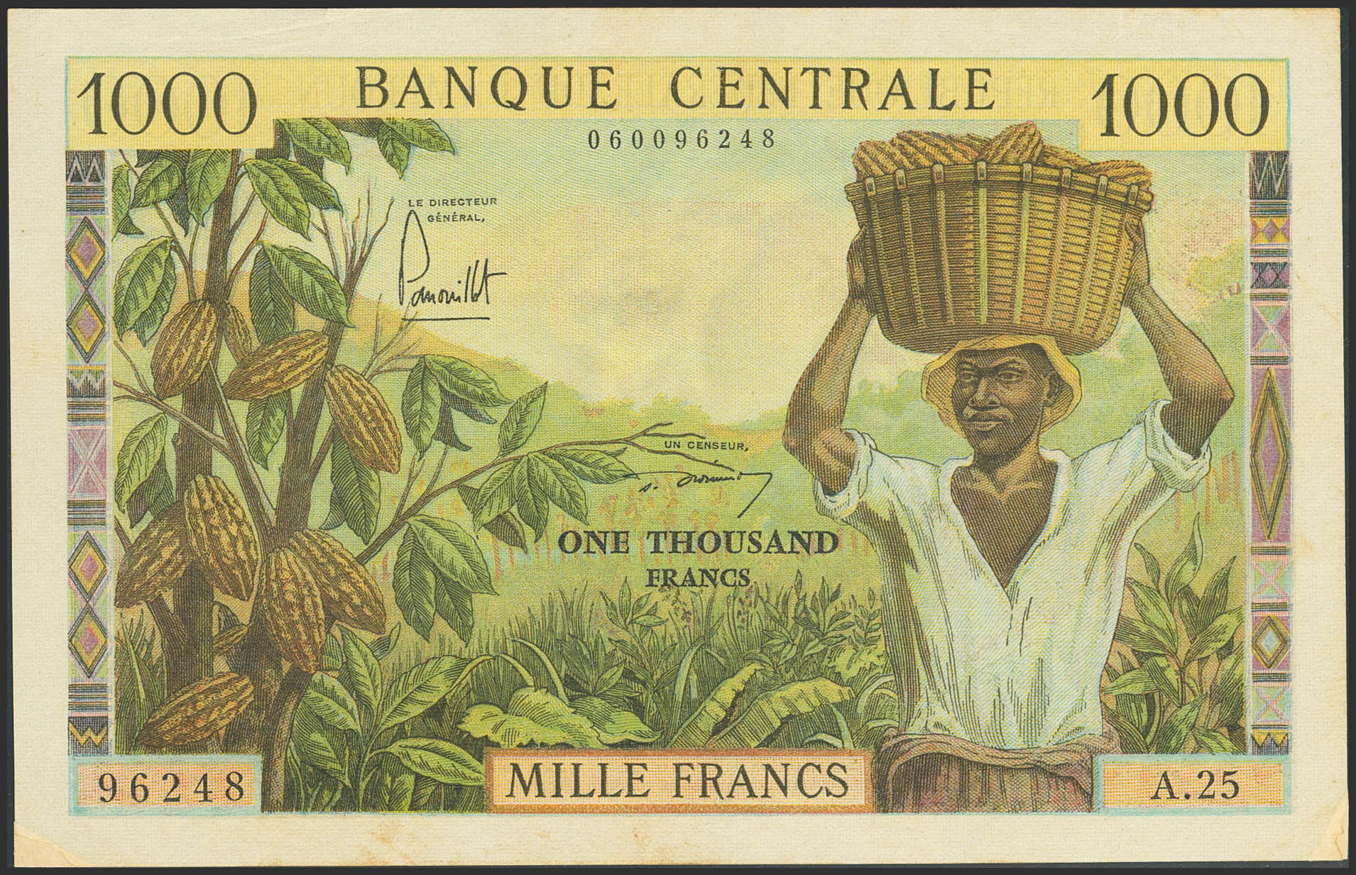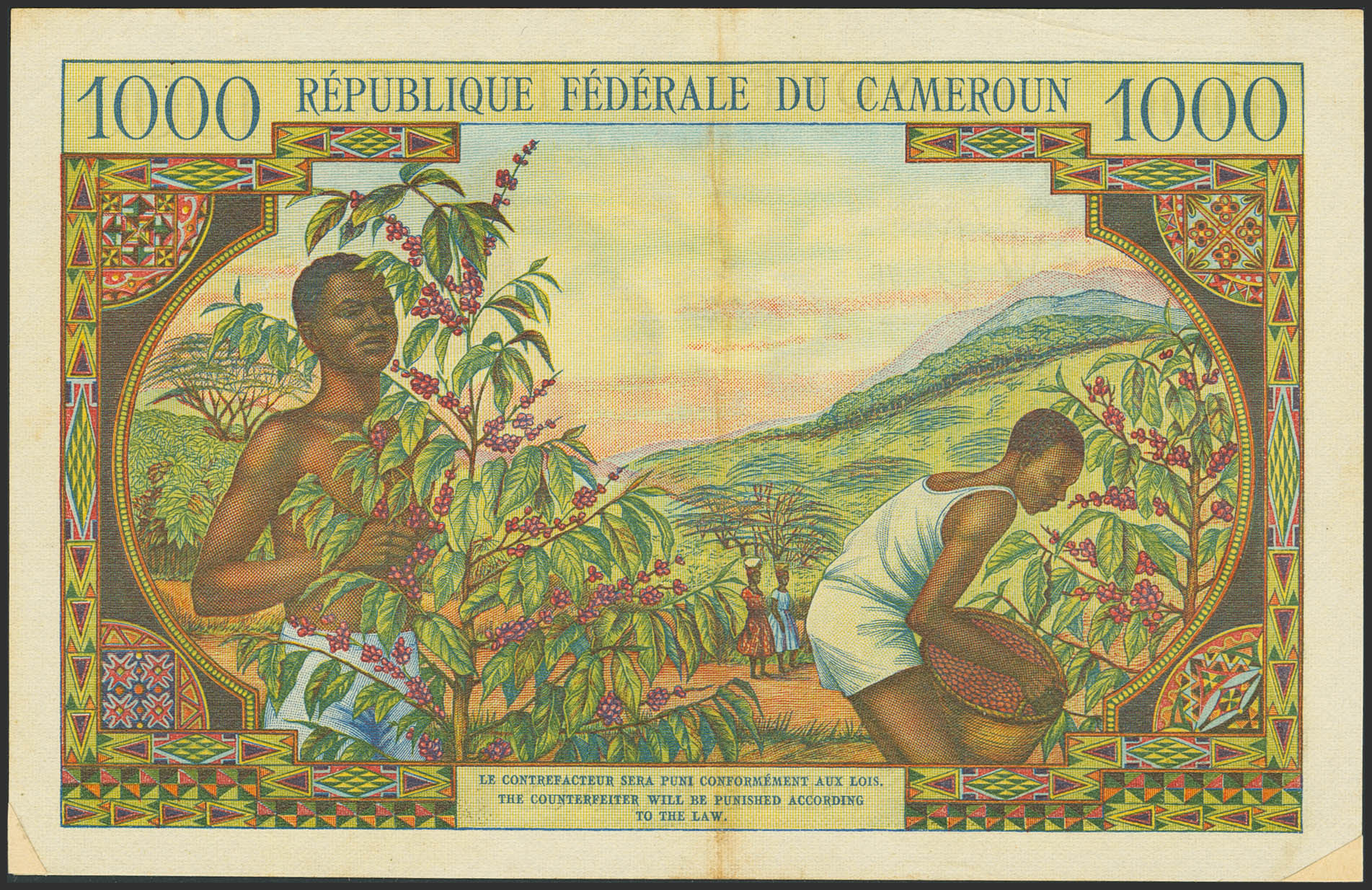 CAMEROON. 1000 Francs. (1962ca). Central Bank. (Pick: 12b). Adhesive paper added over missing corners on lower edge. More than Very Fine.