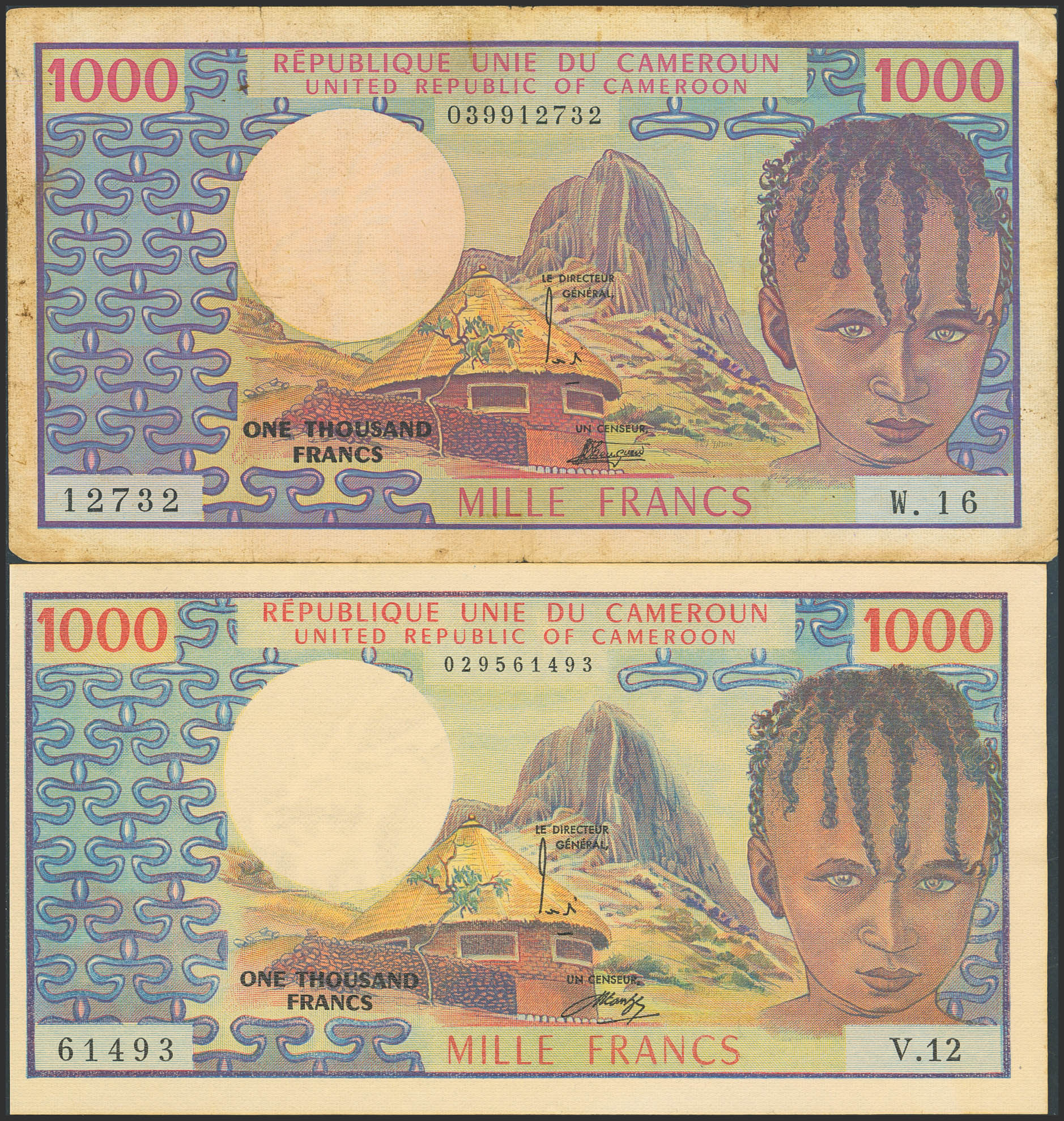 English CAMEROON. Lot of 2 notes of 1000 Francs. (1974ca). Banque des Etats de l'Afrique Centrale. (Pick: 16a, 16b). Almost Uncirculated and Very Fine with tear.