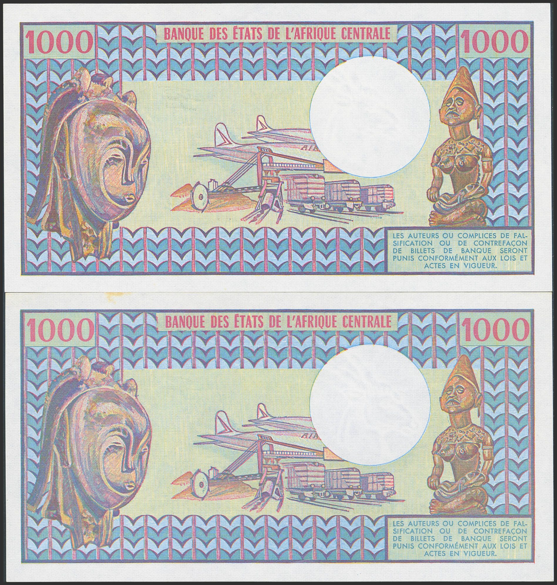 English CAMEROON. Lot of 2 notes of 1000 Francs. 1 April 1978 and 1 July 1980. Banque des Etats de l'Afrique Centrale. (Pick: 16c). Uncirculated with light stain on top edge and Less than Uncirculated.