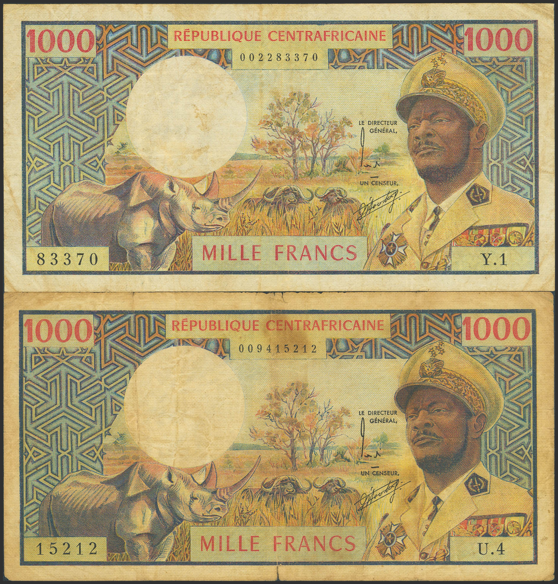 CENTRAL AFRICAN REPUBLIC. Lot of 2 notes of 1000 Francs. (1974ca). Banque des Etats de l'Afrique Centrale. (Pick: 2). Tears. More than Fine.
