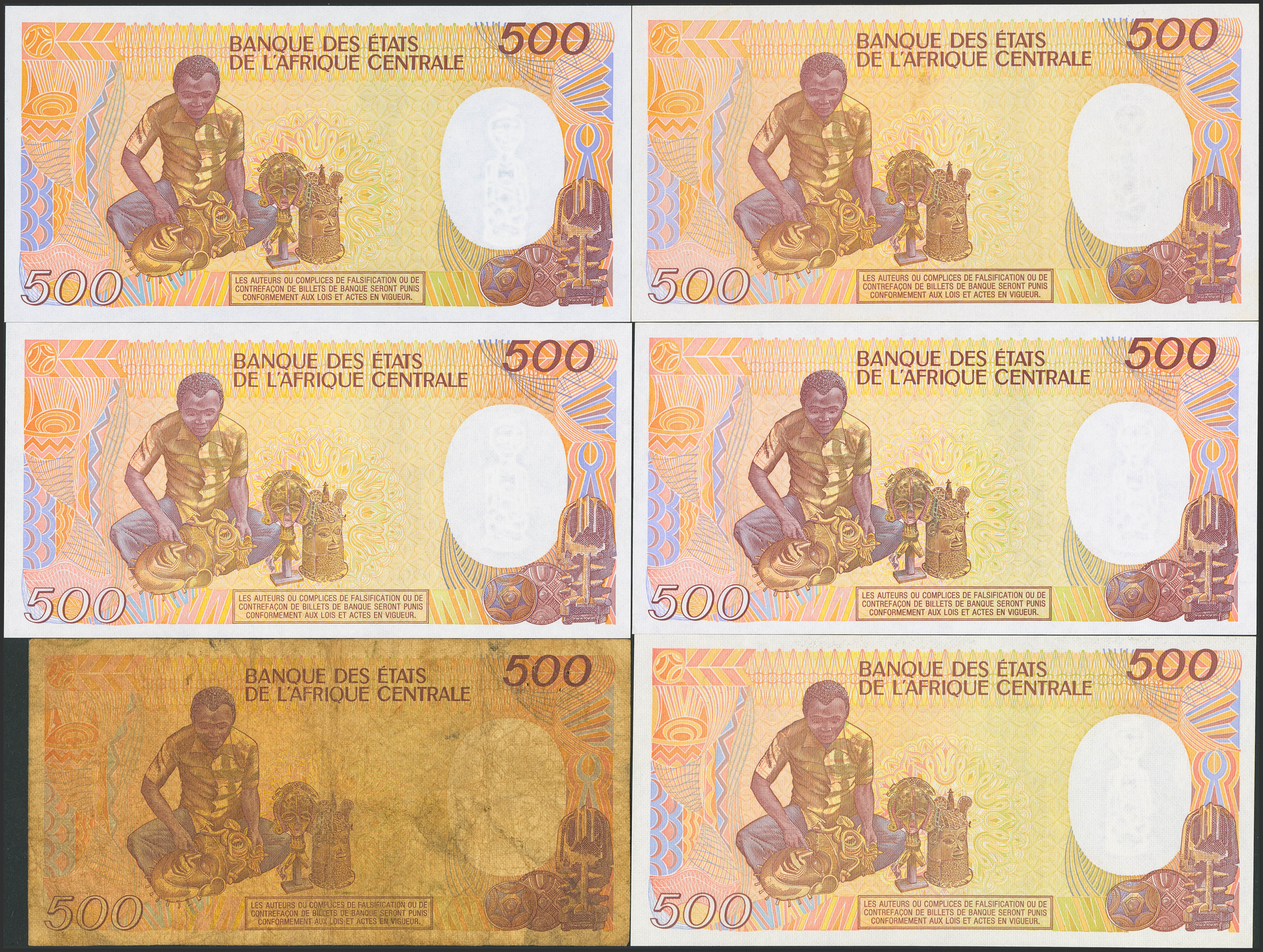 CENTRAL AFRICAN REPUBLIC. Lot of 6 notes of 500 Francs. January 1 from 1985 to 1991. Banque des Etats de l'Afrique Centrale. Republique Centrafricaine. (Pick: 14a, 14b, 14c, 14d(3)). Uncirculated (5) and Fine (1).