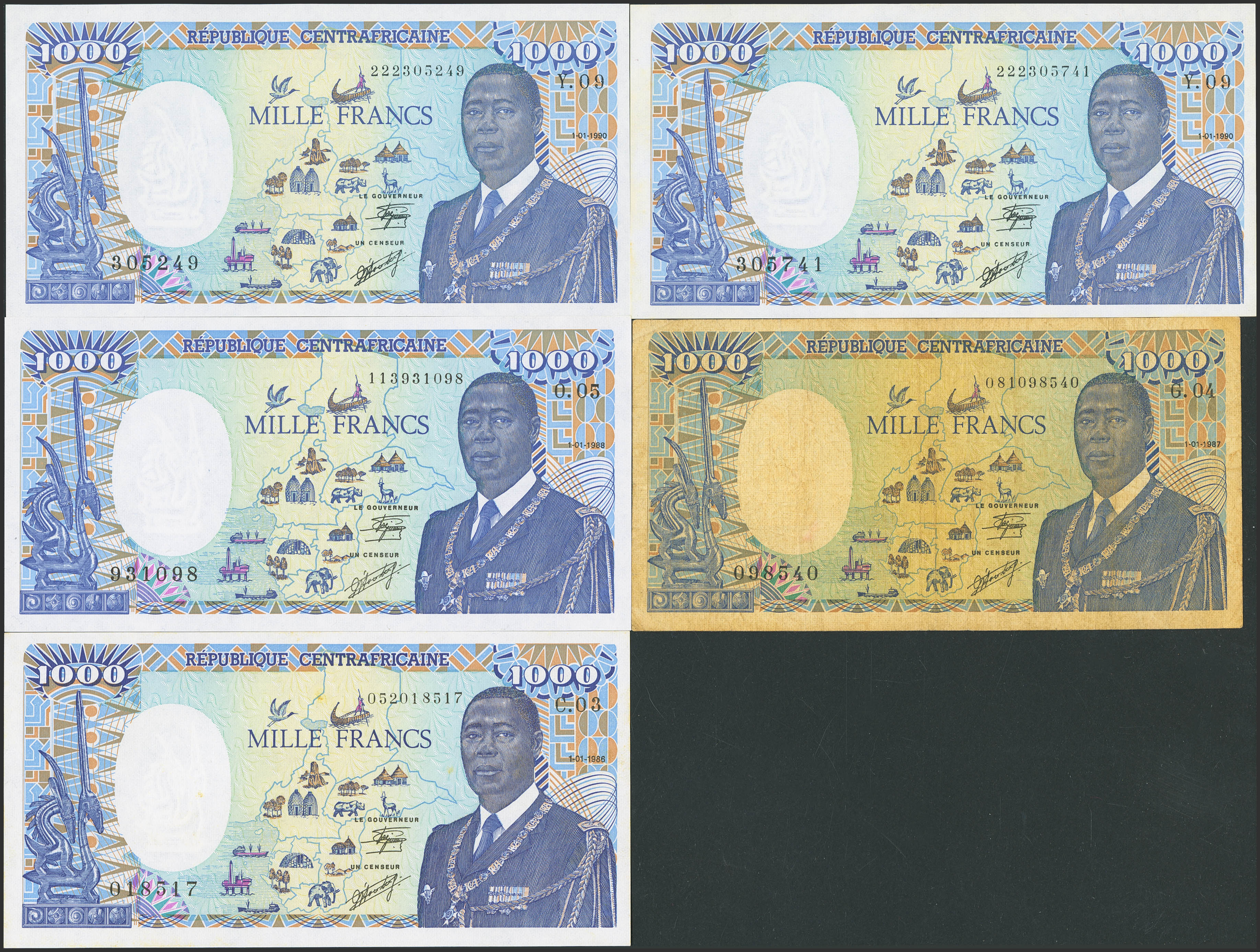 CENTRAL AFRICAN REPUBLIC. Lot of 5 notes of 1000 Francs. January 1 from 1986 to 1990. Banque des Etats de l'Afrique Centrale. Republique Centrafricaine. (Pick: 16). Fine (1), Less than Uncirculated (2) and Uncirculated (2).