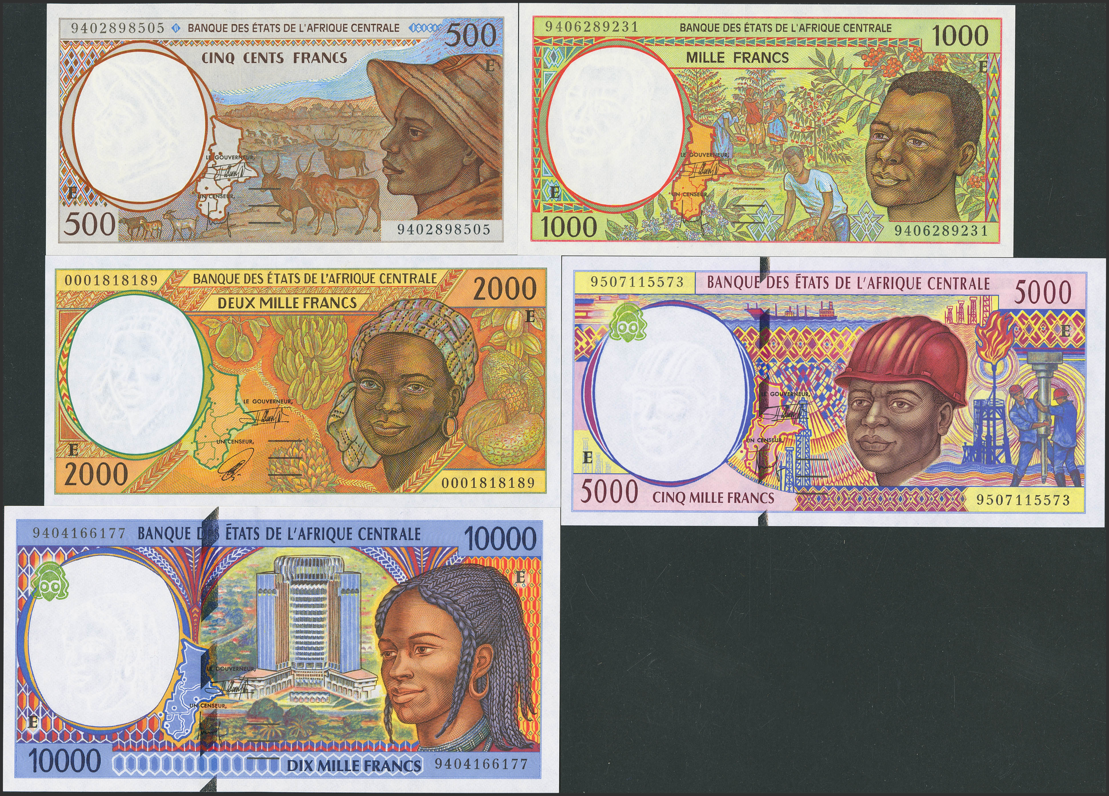 CENTRAL AFRICAN STATES. Complete set of 5 notes from 500 to 10000 Francs. 1994 to 2000. Banque des Etats de l'Afrique Centrale. Cameroon. (Pick: 201Eb, 202Eb, 203Eg, 204Eb, 205Ea). Uncirculated (4) and Almost Uncirculated (1).