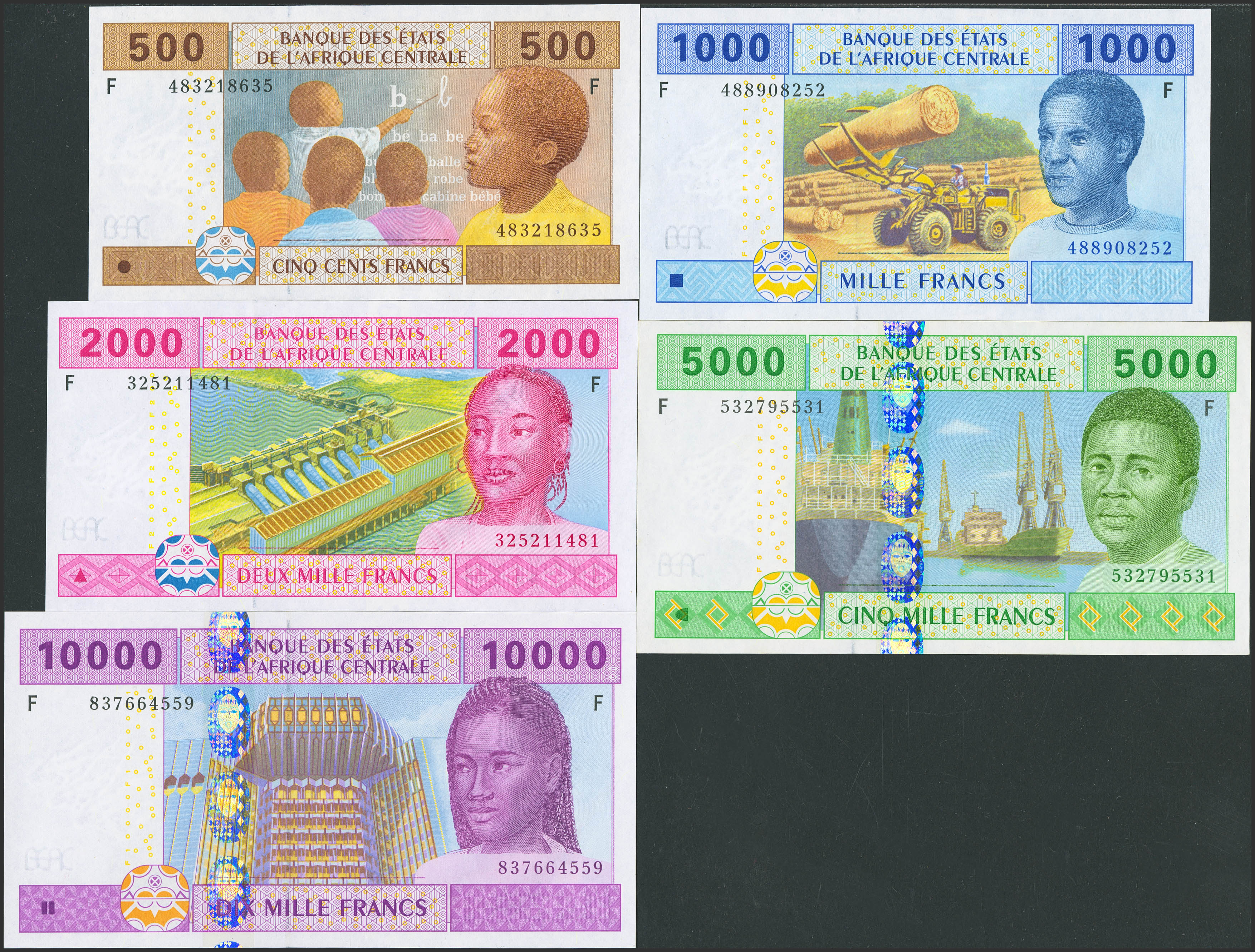 CENTRAL AFRICAN STATES. Complete set of 5 notes from 500 to 10000 Francs. 2002. Banque des Etats de l'Afrique Centrale. Gabon. (Pick: 306Mc, 307Mc, 308Mc, 309Mc, 310Mc). Uncirculated.