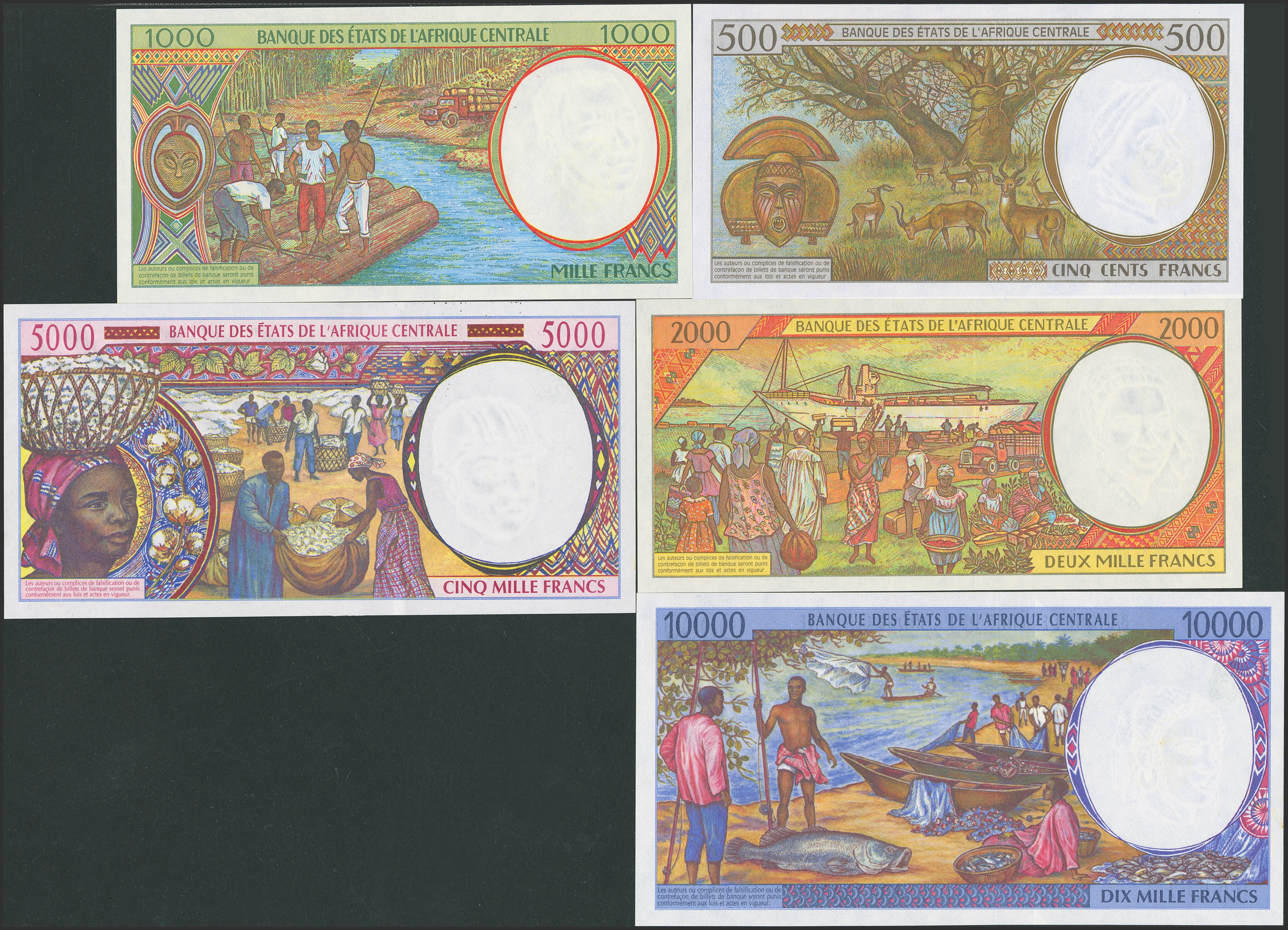 CENTRAL AFRICAN STATES. Complete set from 500 to 10000 Francs. 1993 to 2000. Banque des Etats de l'Afrique Centrale. Equatorial Guinea. (Pick: 501Ng, 502Nb, 503Na, 504Na, 505Na). Less than Uncirculated (2) and Uncirculated (3).