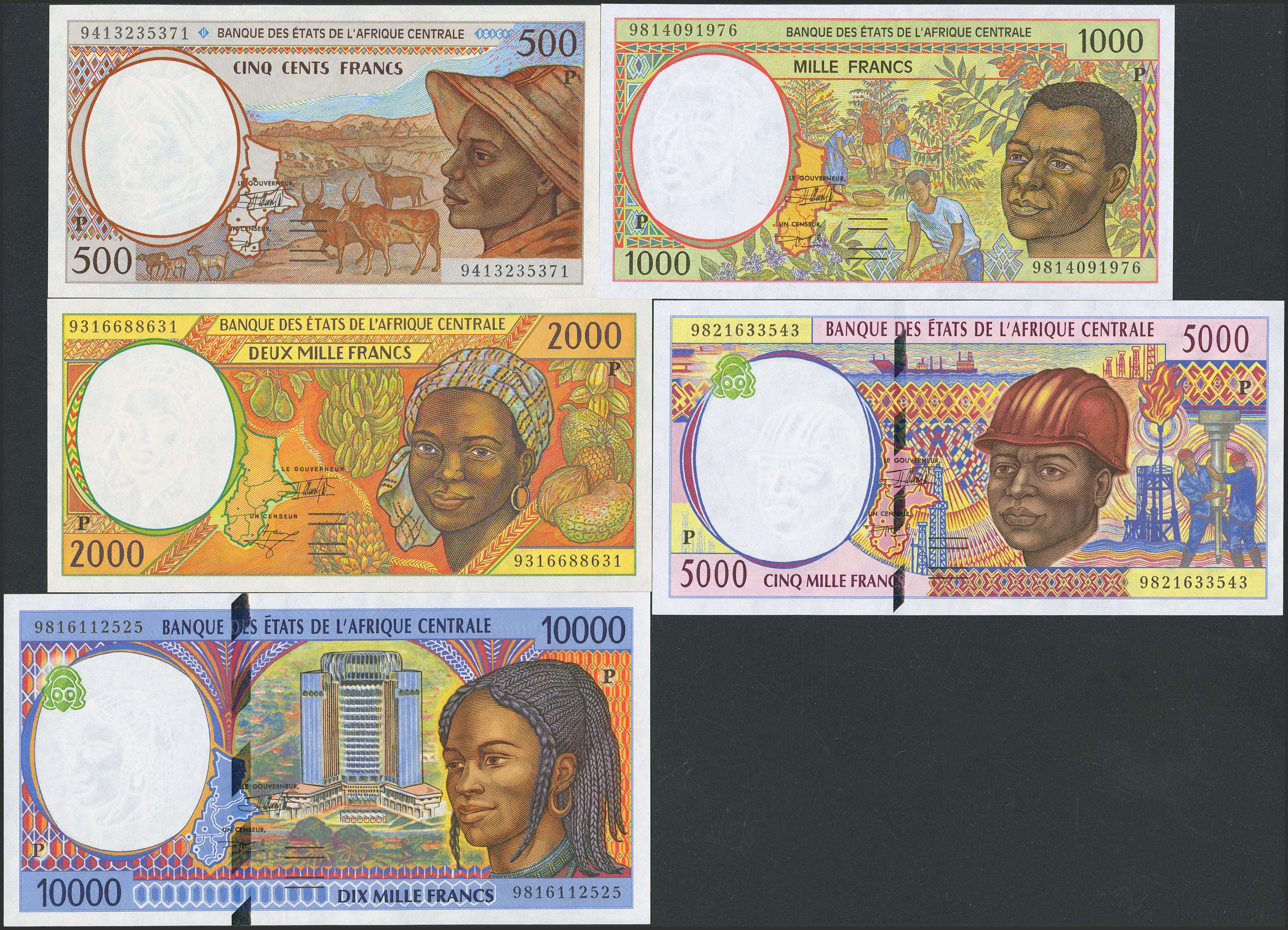 CENTRAL AFRICAN STATES. Complete set of 5 notes from 500 to 10000 Francs. 1993 to 1998. Banque des Etats de l'Afrique Centrale. Chad. (Pick: 601Pb, 602Pe, 603Pa, 604Pd, 605Pd). Uncirculated.