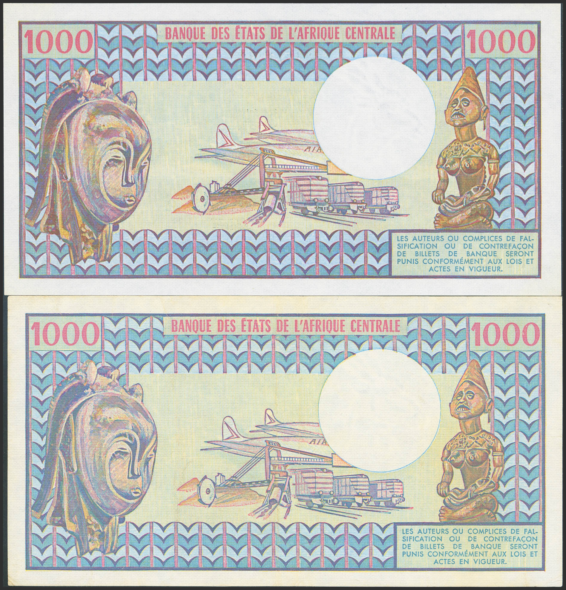 CHAD. Lot of 2 notes of 1000 Francs. 1 June 1980 and 1 June 1984. Banque des Etats de l'Afrique Centrale. (Pick: 7). Uncirculated and Extremely Fine washed and flattened.