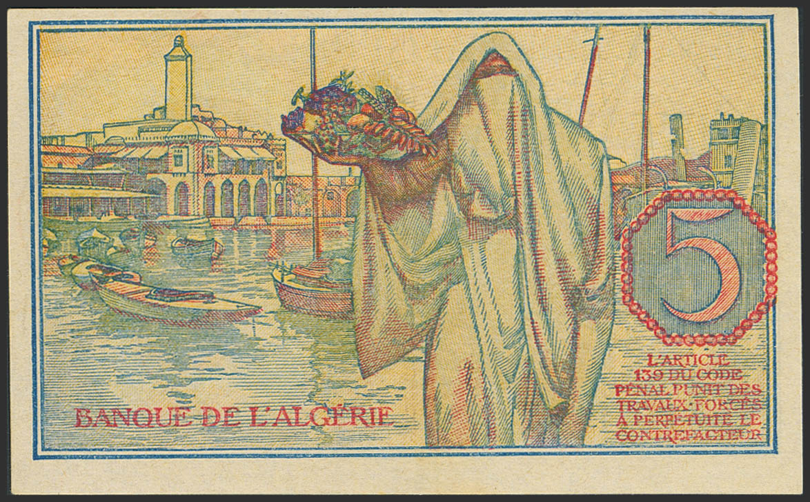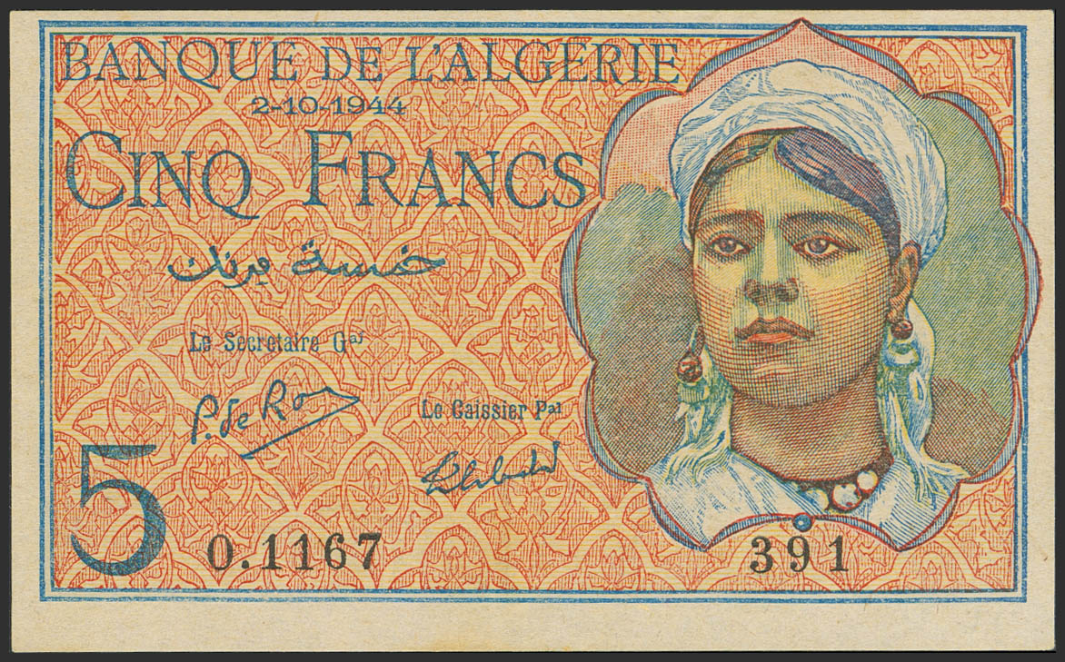 English ALGERIA. 5 French. 2 October 1944. Banque de l'Algerie. (Pick: 94b). More than Extremely Fine.