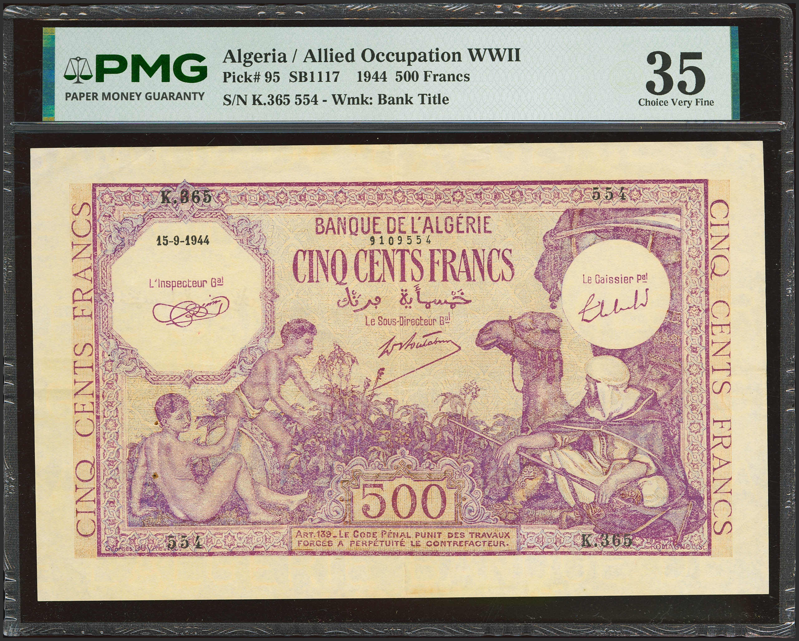 ALGERIA. 500 Francs. 15 September 1944. Banque de l'Algerie. (Pick: 95). PMG35 (pinholes, minor rust).