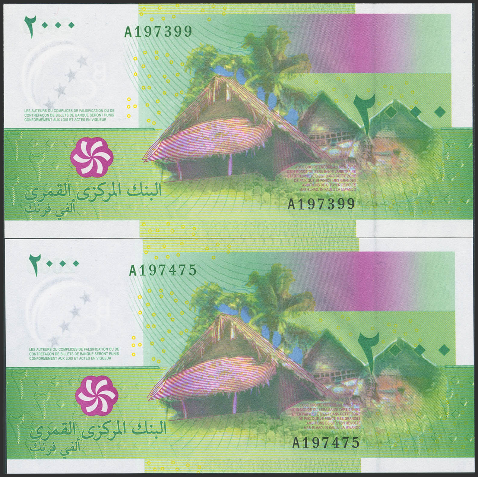 COMOROS. Lot of 2 notes of 2000 Francs. (2005ca). Central Bank. (Pick: 17). Uncirculated.