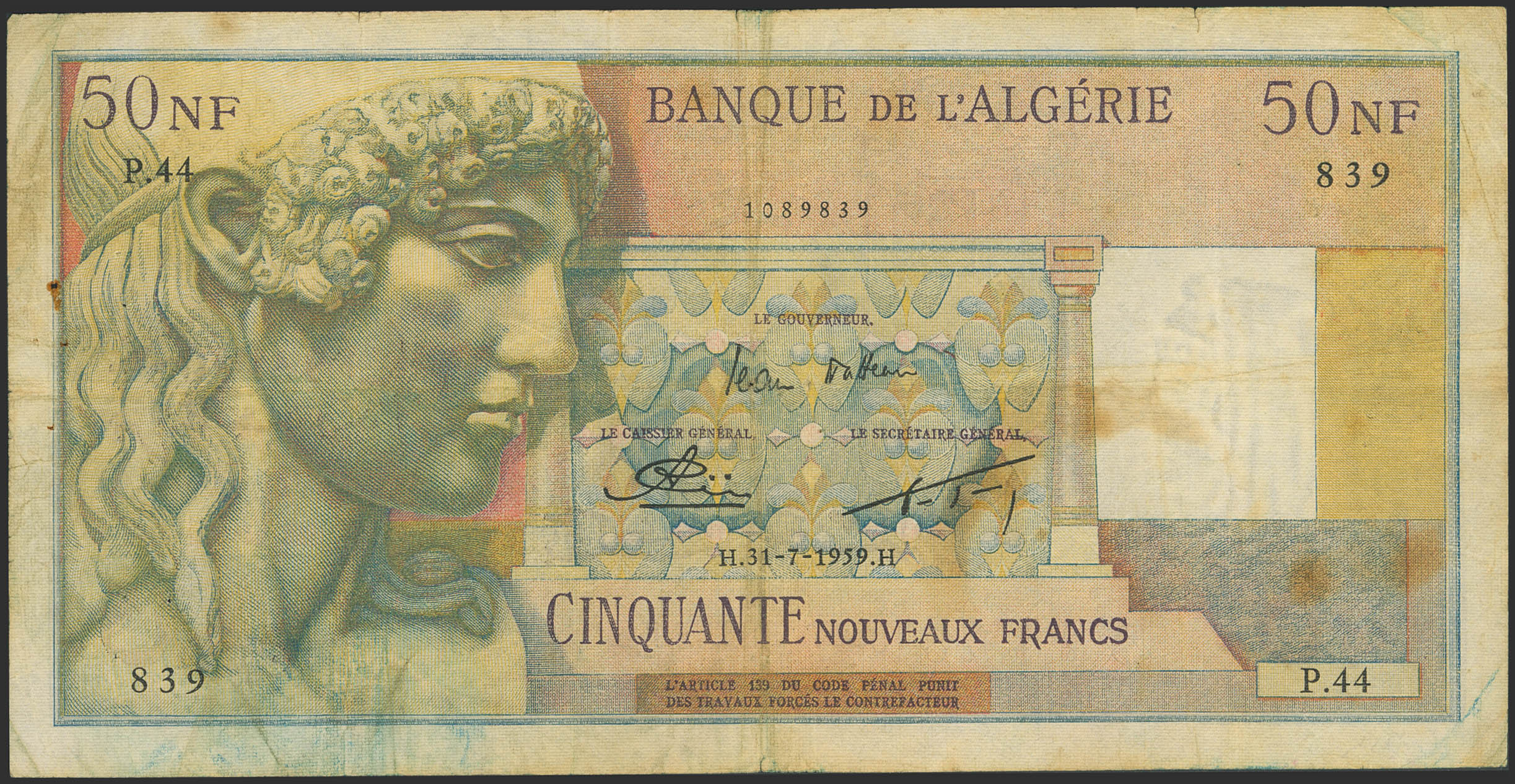 ALGERIA. 50 New French. 31 July 1959. Banque de l'Algerie. (Pick: 102a). Pinholes. Fine.