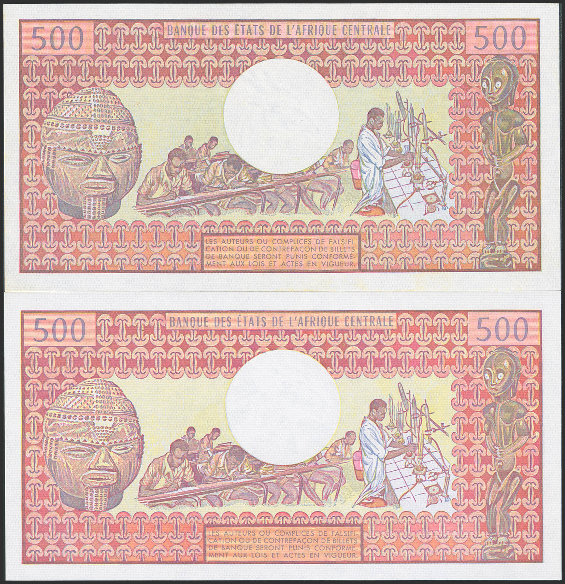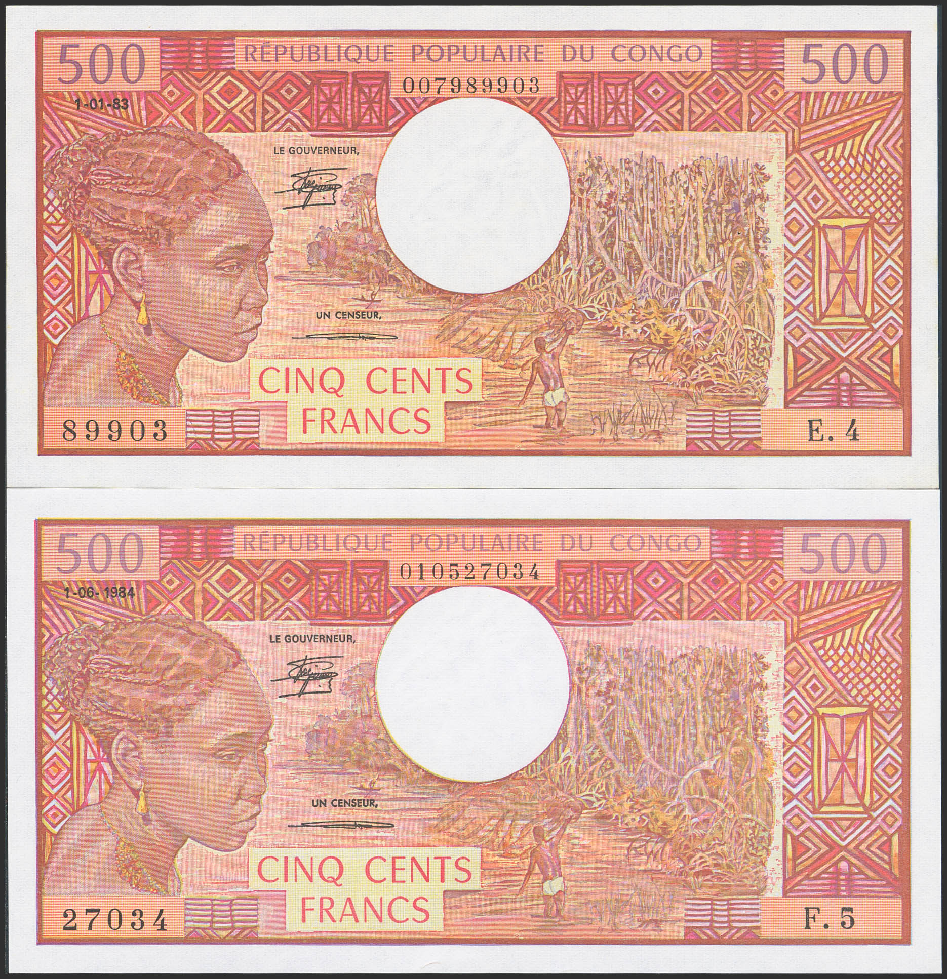 English CONGO. Lot of 2 notes of 500 Francs. 1983 and 1984. Banque Centrale des Etats del'Afrique Centrale. (Pick: 2d). Pinhole on one of them. Less than Uncirculated.