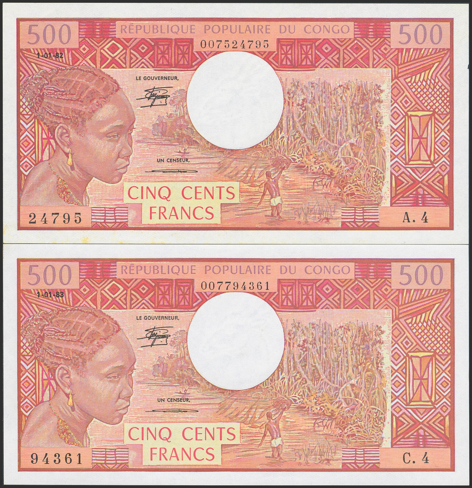 English CONGO. Lot of 2 notes of 500 Francs. 1982 and 1983. Banque Centrale des Etats del'Afrique Centrale. (Pick: 2d). Light yellow stains on the margin of one of them. Less than Uncirculated.