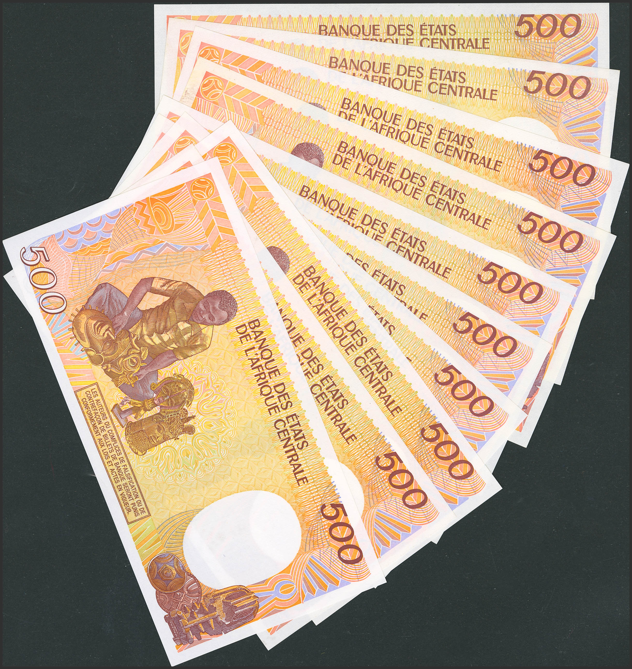 CONGO. Lot of 10 notes of 500 Francs. January 1 from 1985 to 1991. Banque Centrale des Etats del'Afrique Centrale. Republique Populaire du Congo. (Pick: 8a(4), 8c(3), 8d(3)). Uncirculated (9) and Less than Uncirculated (1).