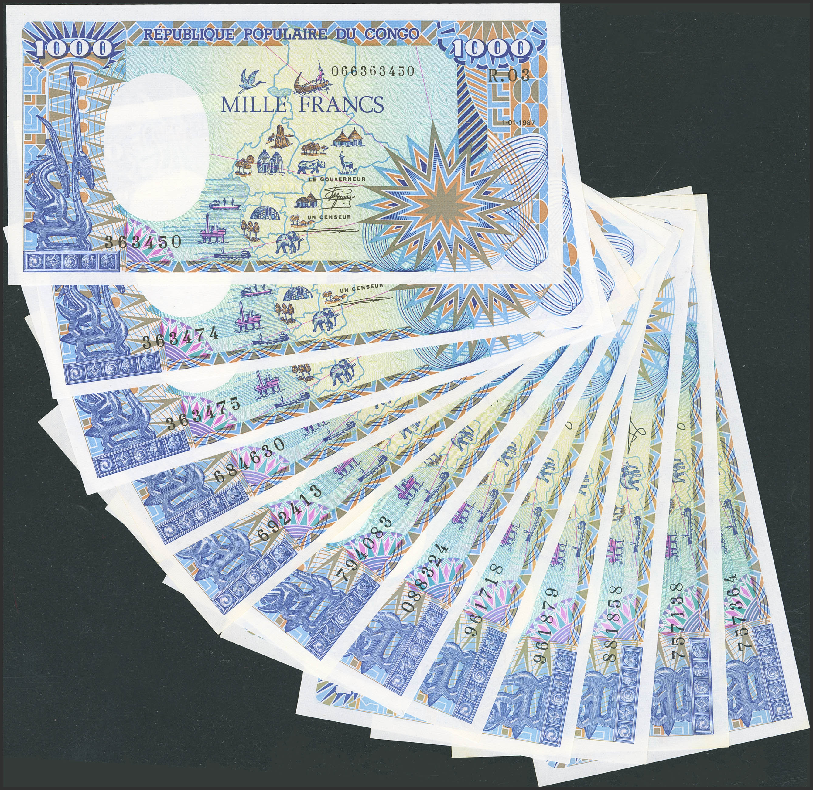 CONGO. Lot of 12 notes of 1000 Francs. January 1 from 1987 to 1991. Banque Centrale des Etats del'Afrique Centrale. Republique Populaire du Congo. (Pick: 10a(5), 10b(2), 10c(5)). Almost Uncirculated (3) and Uncirculated (9).