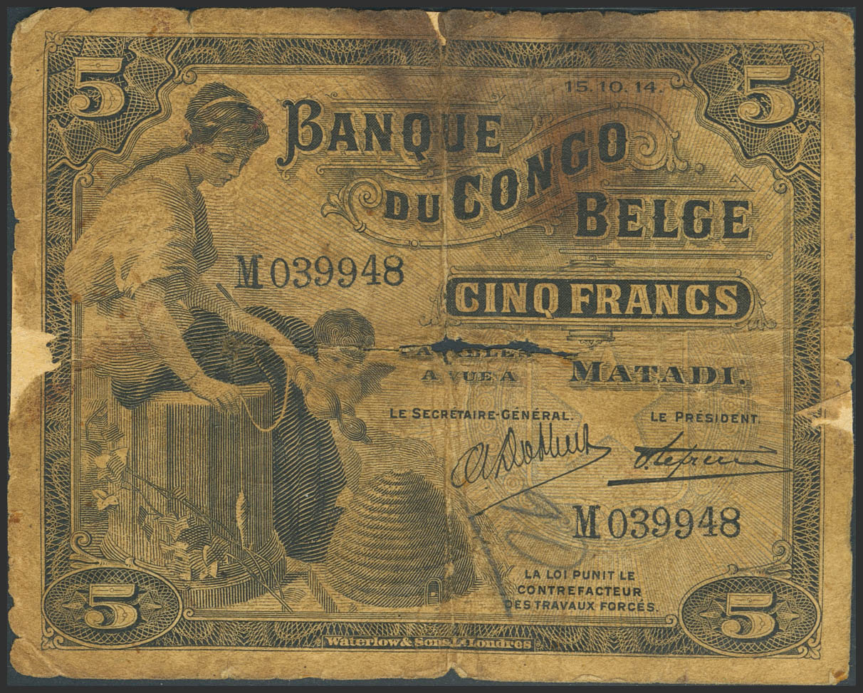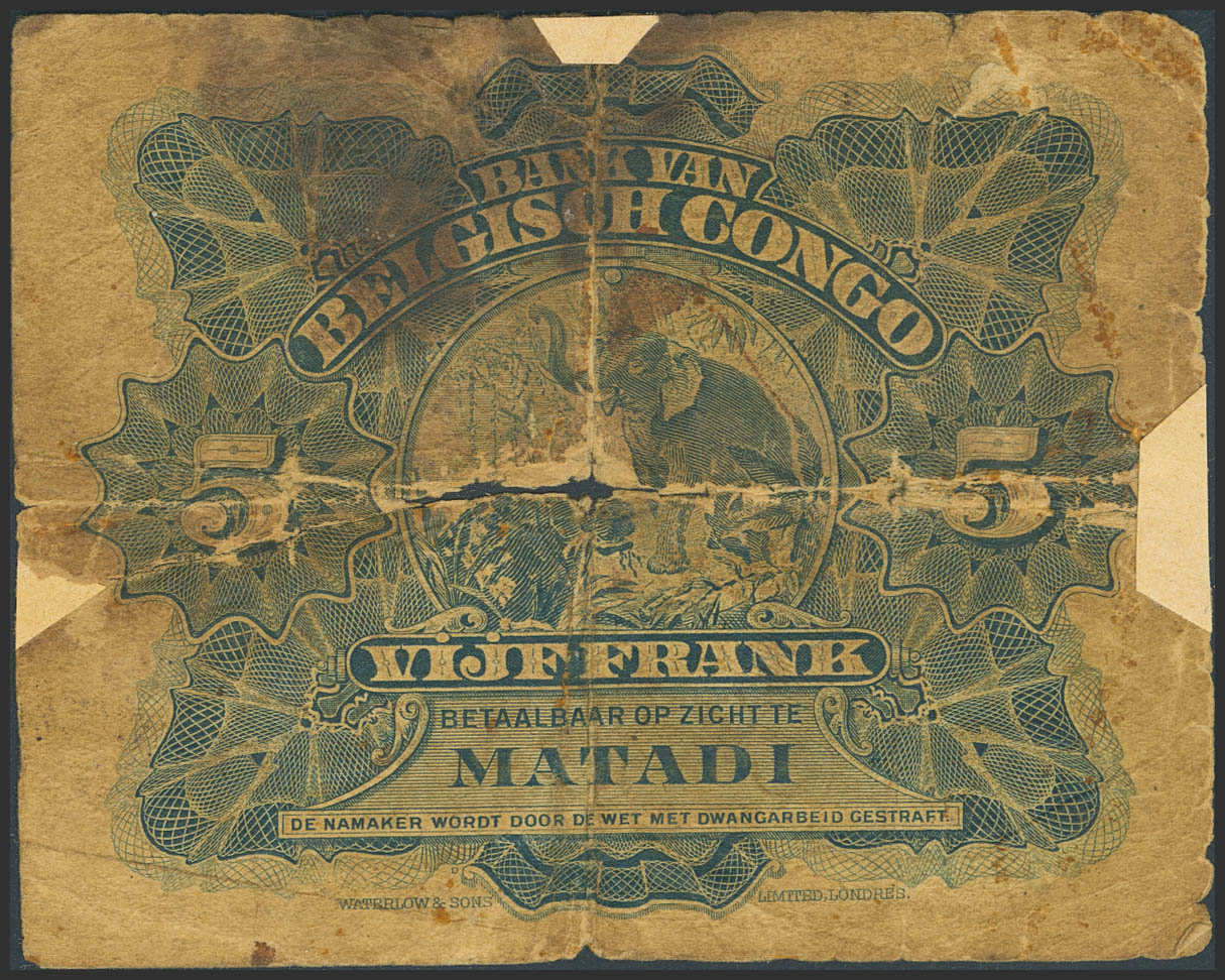 BELGIAN CONGO. 5 French. 15 October 1914. Banque du Congo Belge. Matadi. (Pick: 4B). Splits and tears, and paper added in areas where paper is missing. Good.