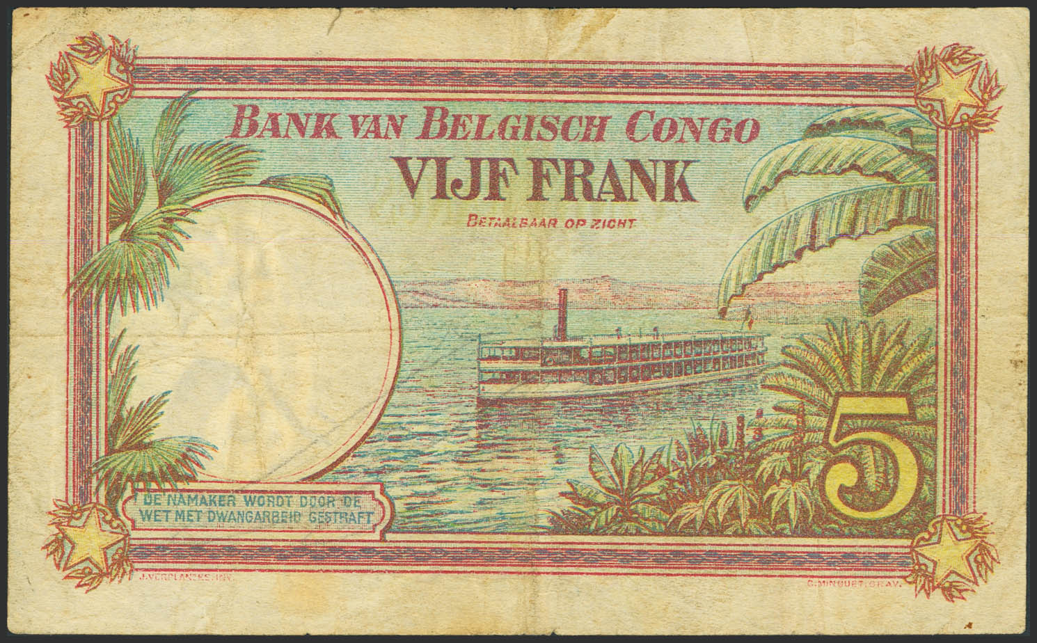 BELGIAN CONGO. 5 French. 21 January 1929. Banque du Congo Belge. Without place of issue. (Pick: 8e). Very Fine.