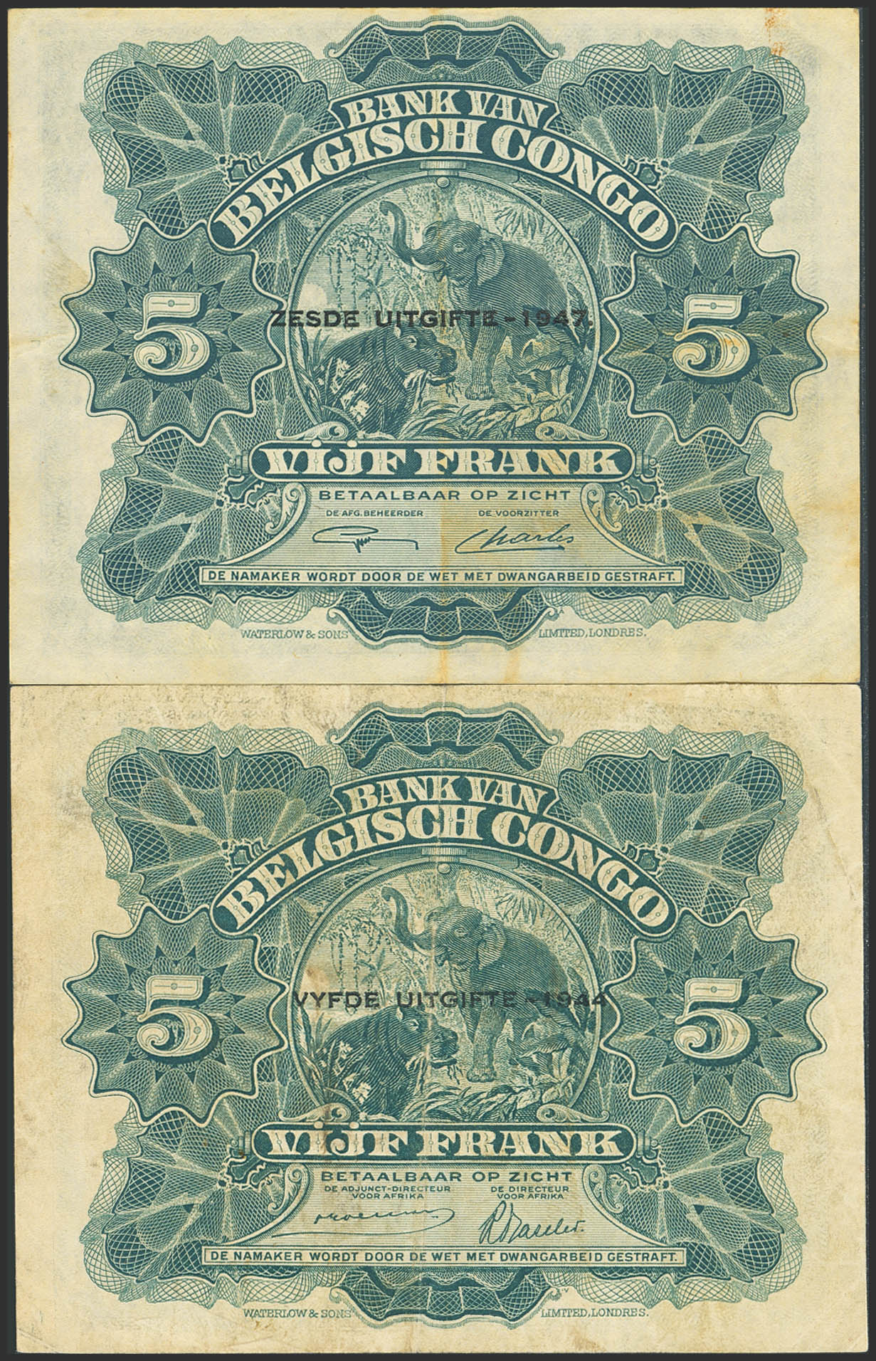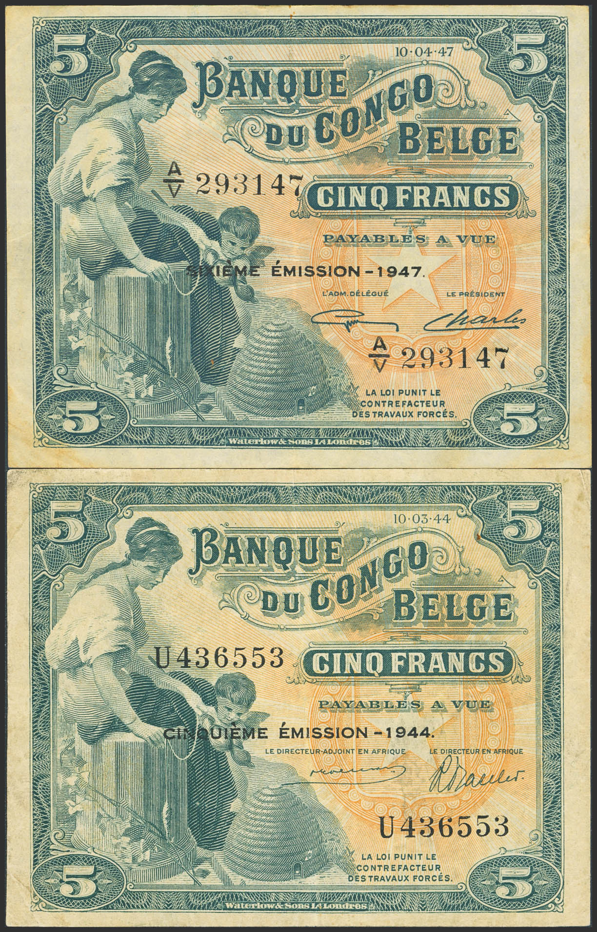 BELGIAN CONGO. Lot of 2 notes of 5 Francs. 1944 and 1947. Banque du Congo Belge. (Pick: 13Ac, 13Ad). More than Very Fine and Extremely Fine.