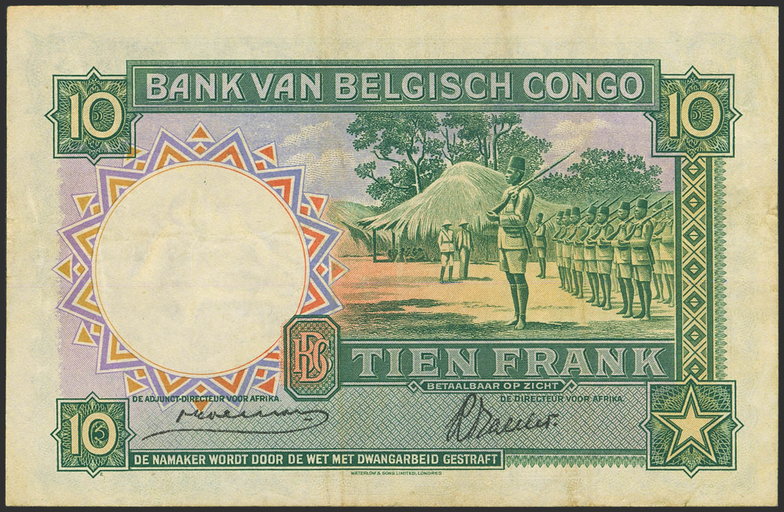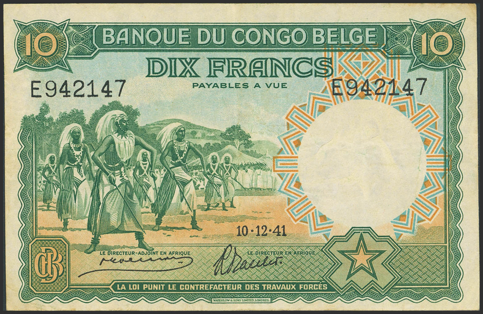 BELGIAN CONGO. 10 French. 10 December 1941. Banque du Congo Belge. (Pick: 14). More than Very Fine.