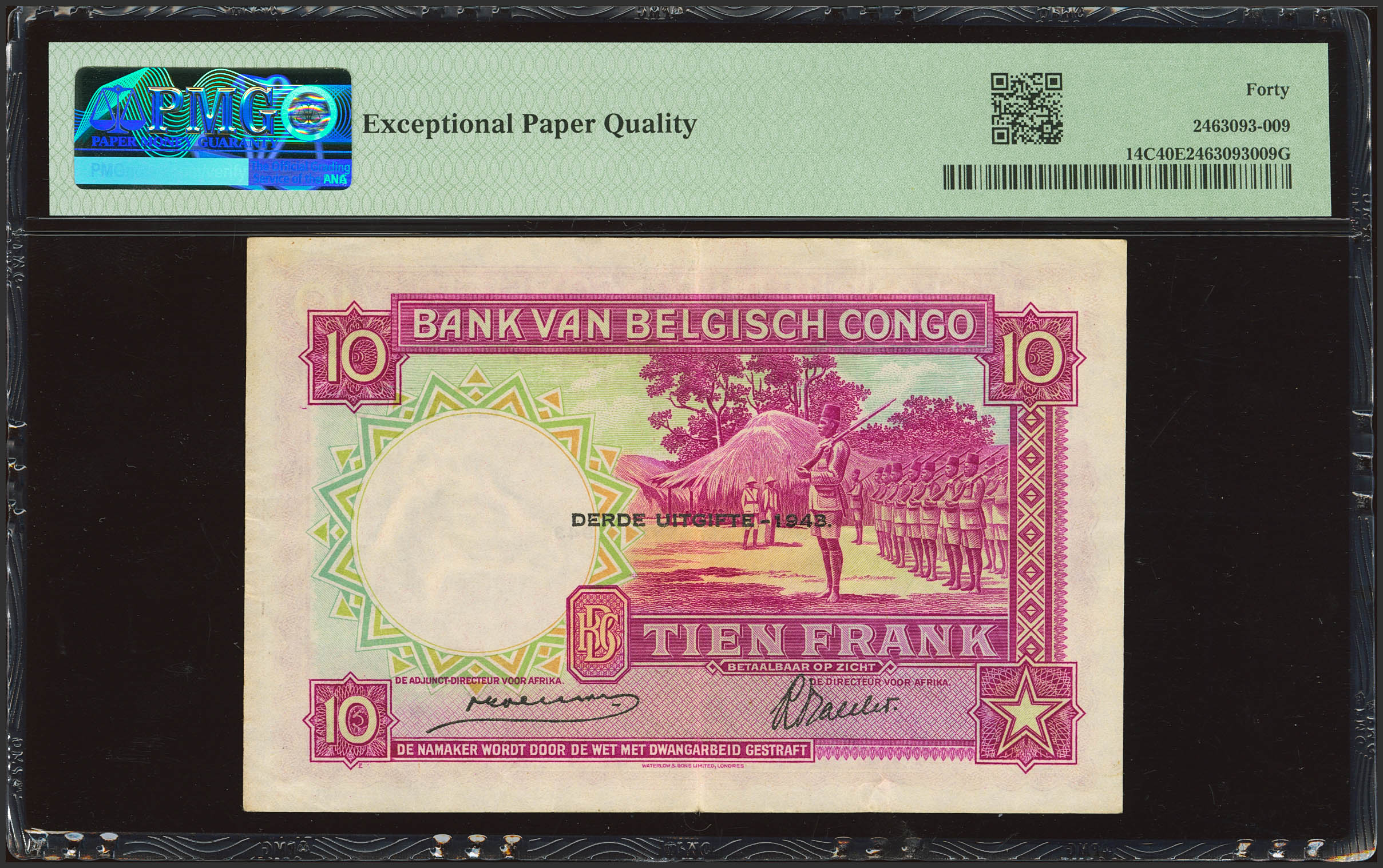 BELGIAN CONGO. 10 French. 10 February 1943. Banque du Congo Belge. (Pick: 14C). PMG40EPQ.