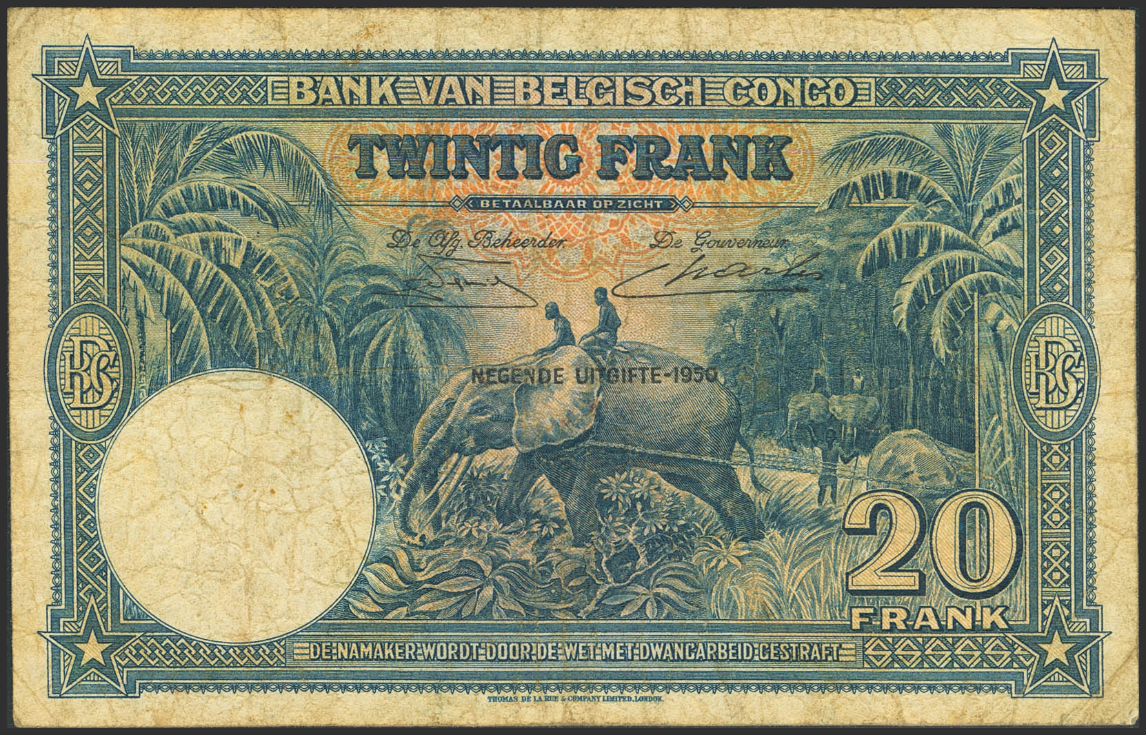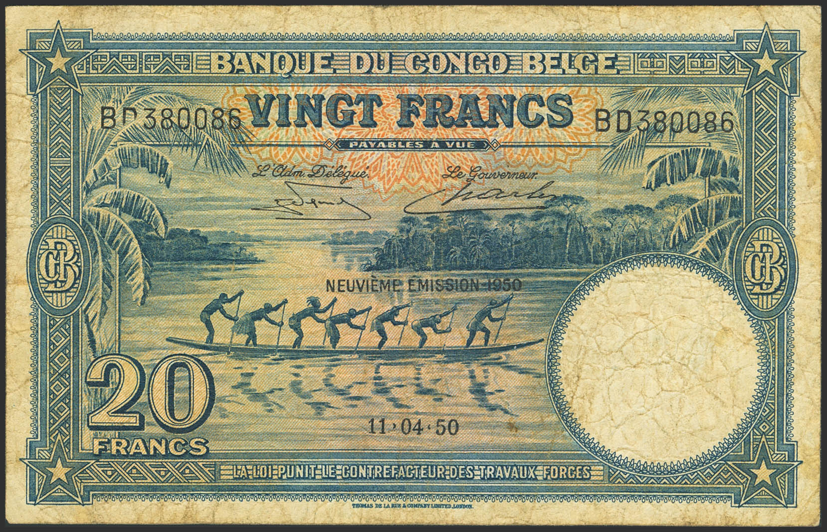 BELGIAN CONGO. 20 Francs. 11 April 1950. Banque du Congo Belge. (Pick: 3:00 p.m.). Fine.