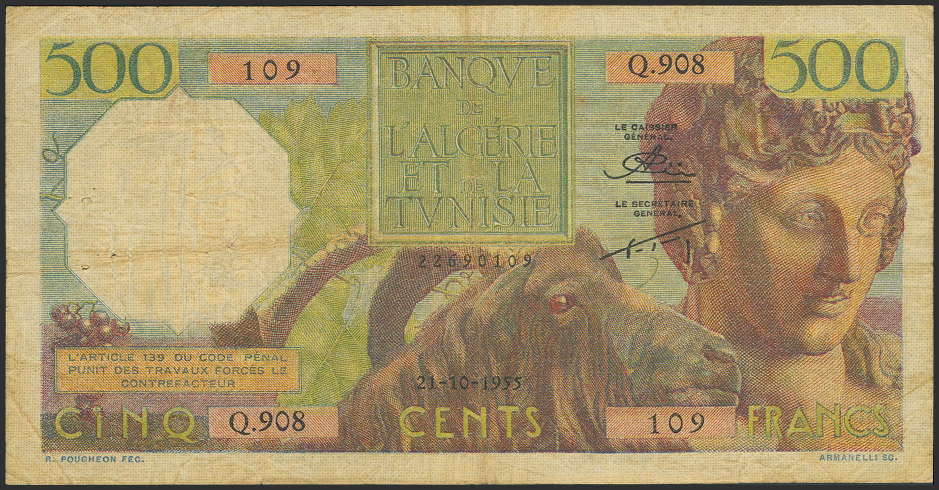 ALGERIA. 500 Francs. 21 October 1955. Banque de l'Algerie et de la Tunisie. (Pick: 106). Fine.