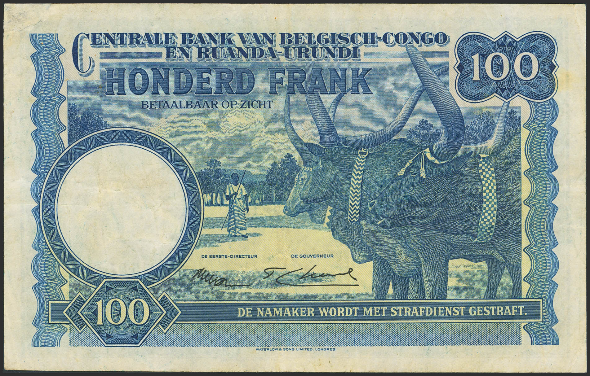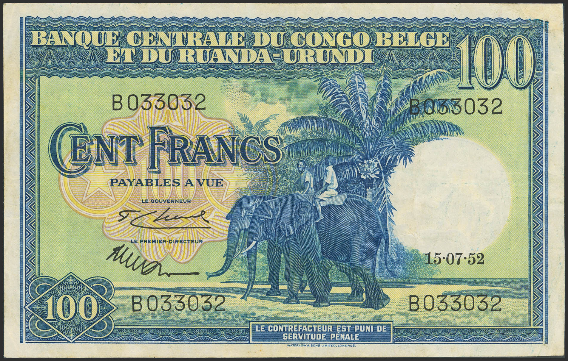 BELGIAN CONGO. 100 Francs. 15 July 1952. Banque Centrale du Congo Belge et du Ruanda-Urundi. (Pick: 25a). More than Very Fine.