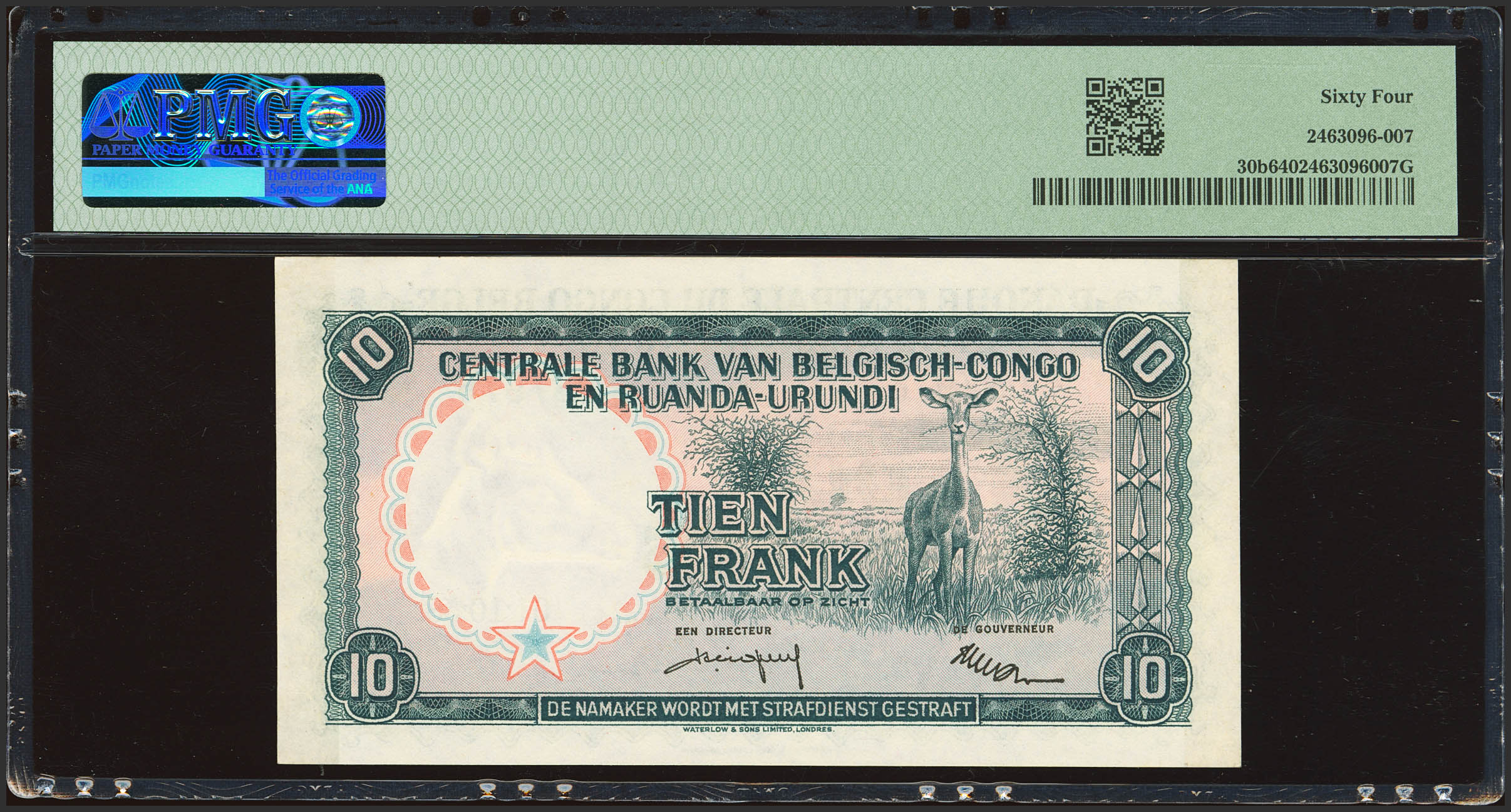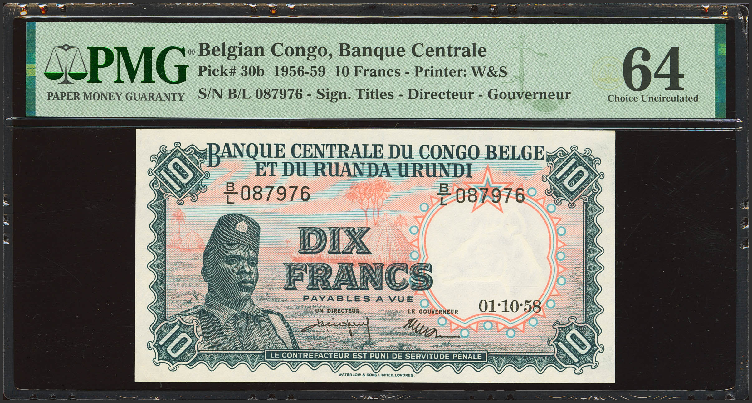 BELGIAN CONGO. 10 French. 1 October 1958. Banque Centrale du Congo Belge et du Ruanda-Urundi. (Pick: 30b). PMG64.