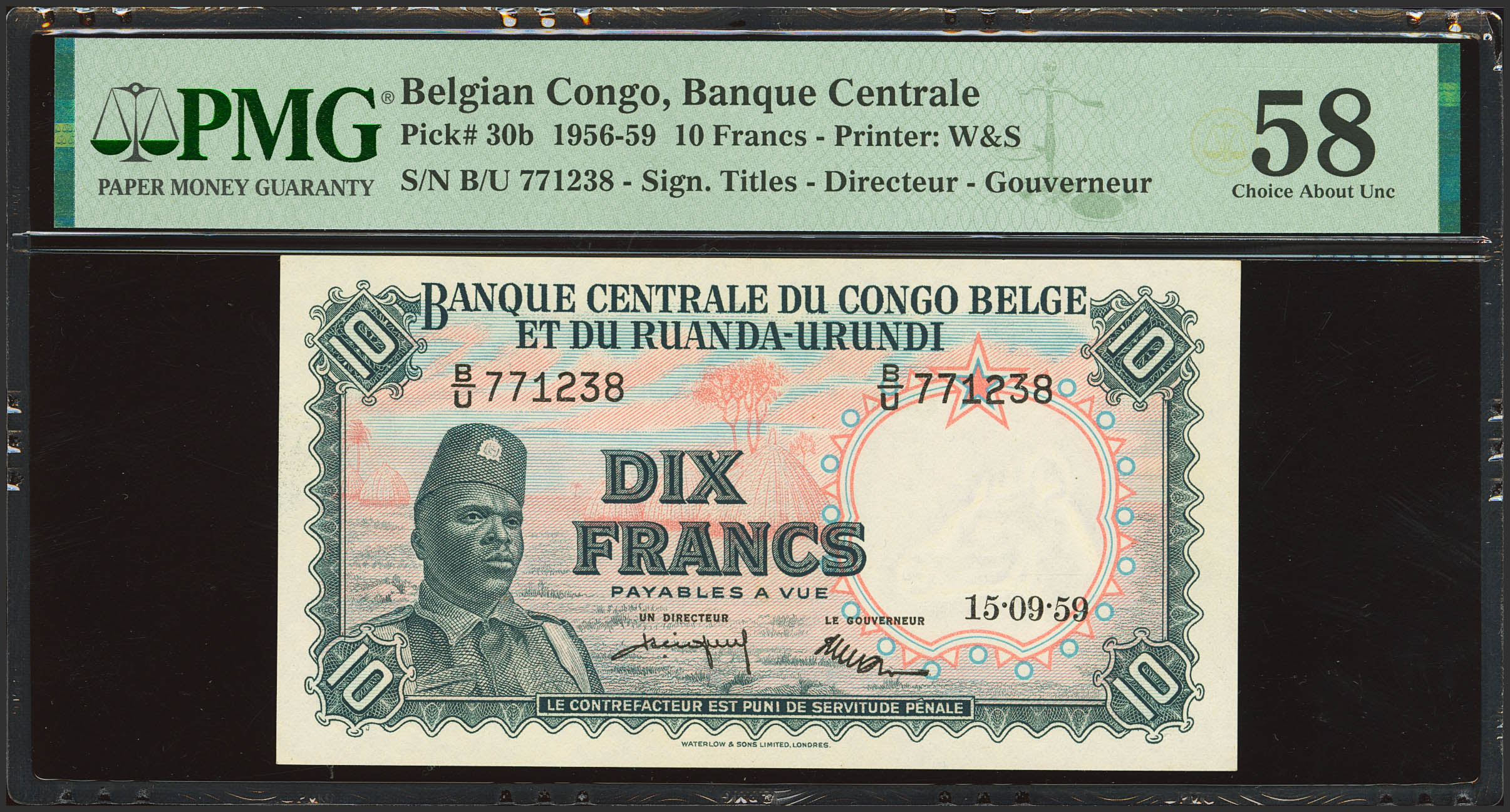 BELGIAN CONGO. 10 French. 15 September 1959. Banque Centrale du Congo Belge et du Ruanda-Urundi. (Pick: 30b). PMG58.