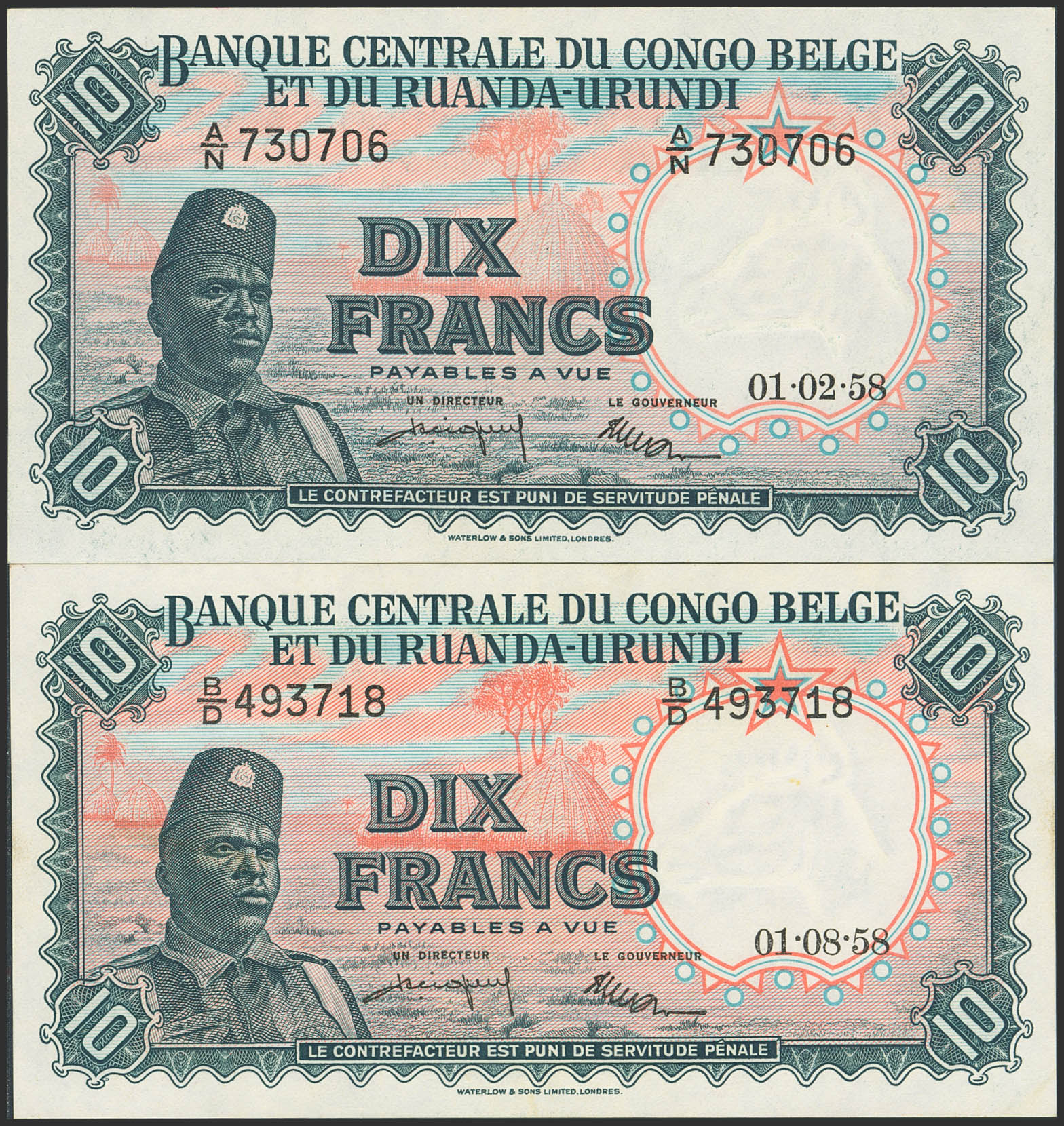 English BELGIAN CONGO. Lot of 2 notes of 10 Francs. 1958. Banque Centrale du Congo Belge et du Ruanda-Urundi. (Pick: 30b). Almost Uncirculated and More than Extremely Fine.